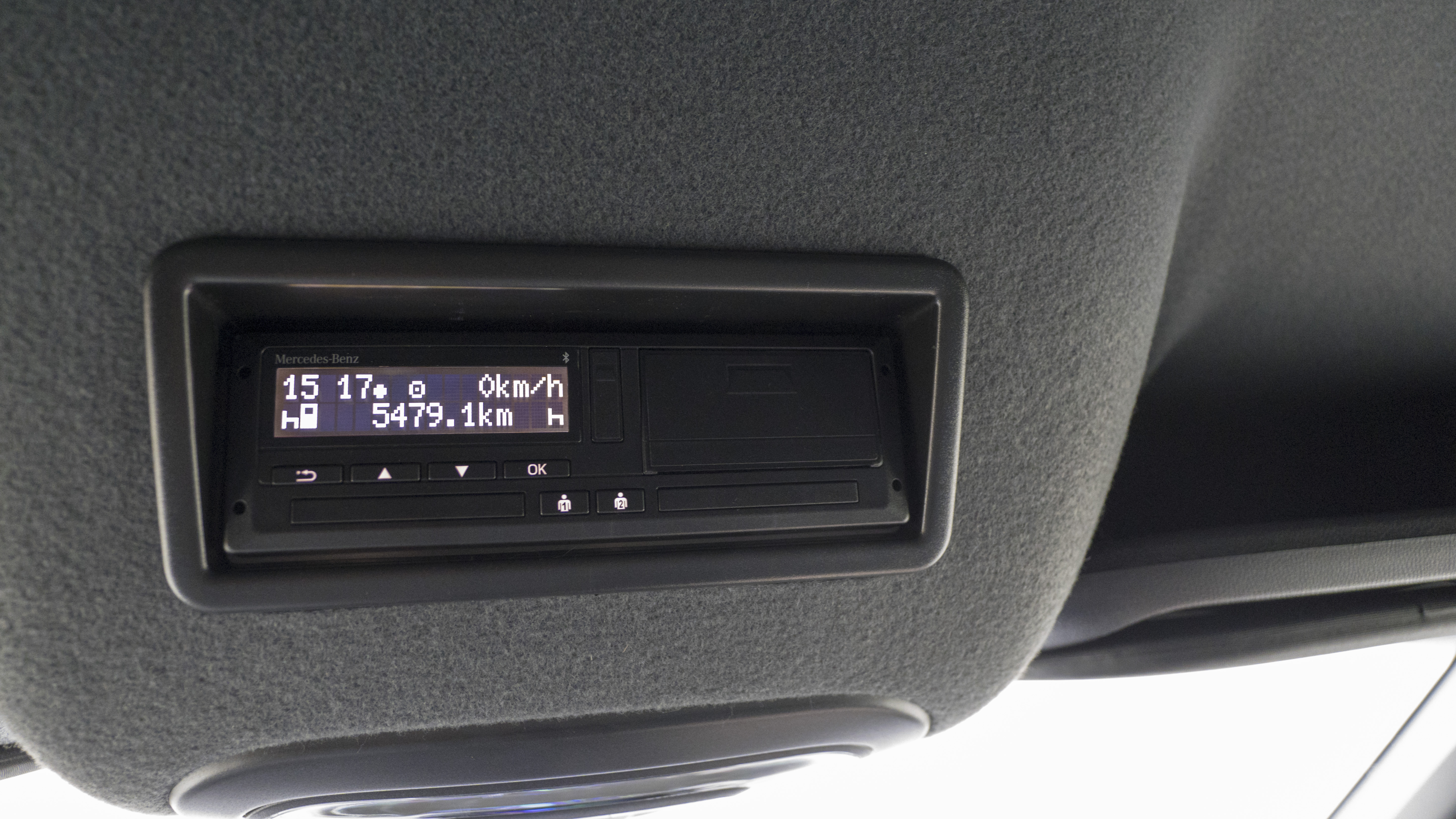 Zľava: Tachograf je súčasťou výbavy/ Systém MBUX je prevzatý z osobných modelov/ Palubná doska je hybridná, s displejom multimediálneho systému