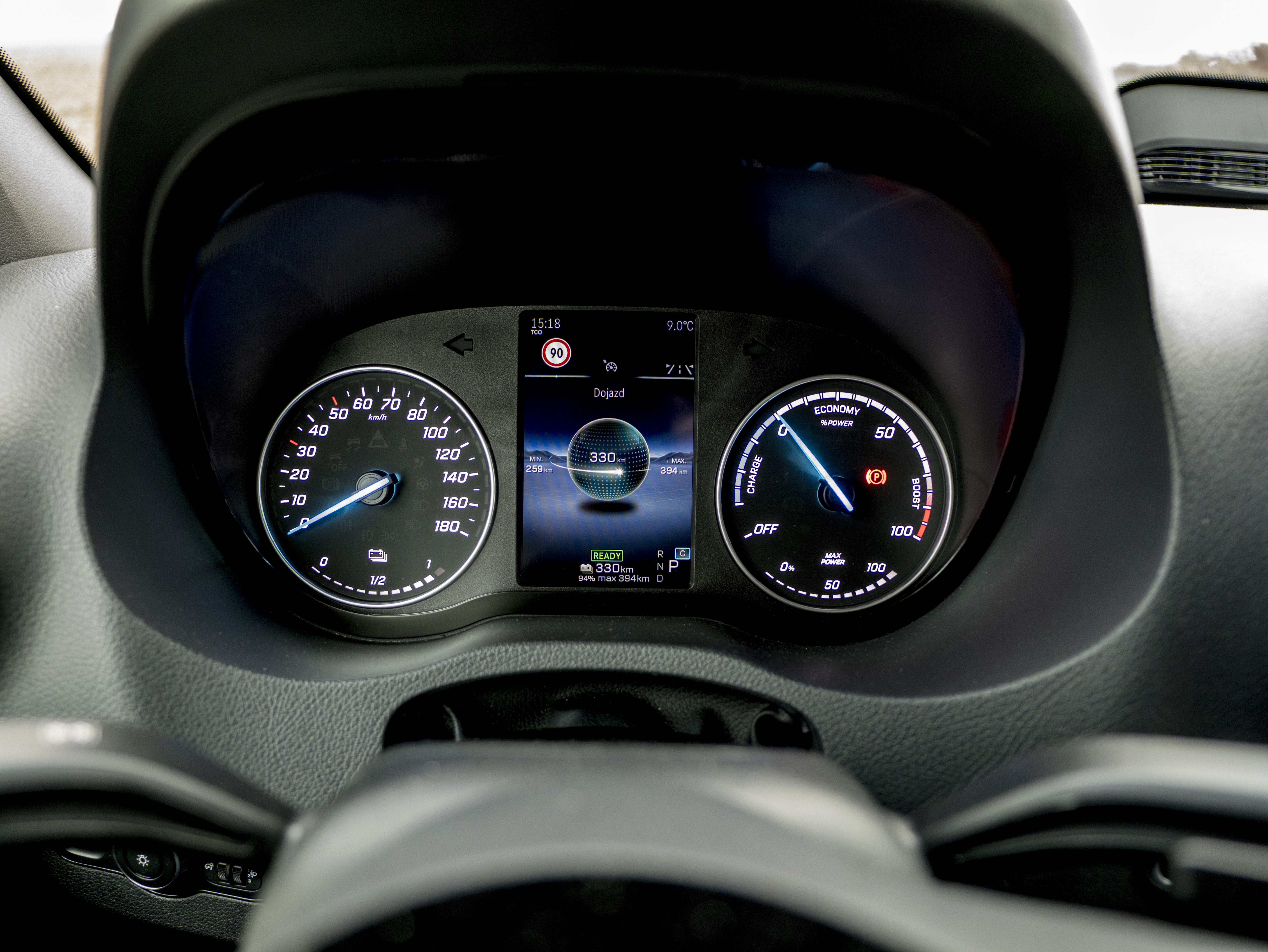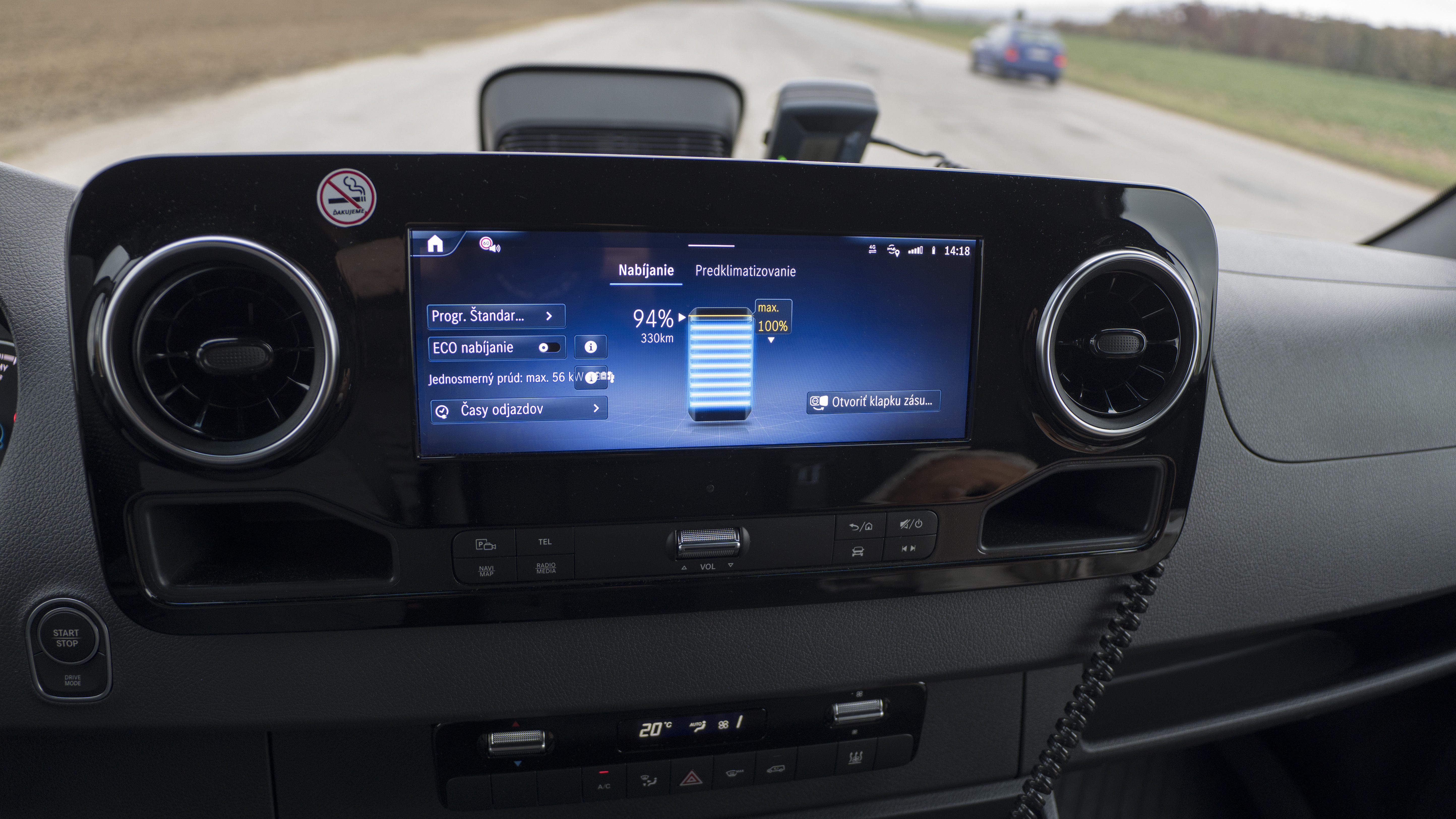 Modernizáciou prešla aj technologická výbava, a tak eSprinter využíva najnovšiu generáciu multimediálneho systému MBUX, ktorý obsahuje funkcie, ako je hlasový asistent „Hey Mercedes“ a inteligentná navigácia s elektrickou inteligenciou. Táto navigácia dokáže plánovať optimálnu trasu vrátane nabíjacích zastávok a zohľadňuje aktuálnu dopravnú situáciu aj topografiu. Bezpečnosť zvyšujú systémy ako Active Brake Assist, ktorý pomáha pri núdzovom brzdení, Blind Spot Assist na sledovanie mŕtveho uhla a ATTENTION ASSIST, ktorý monitoruje pozornosť vodiča. Širokouhlá zadná kamera poskytuje jasný pohľad na situáciu za vozidlom, čo uľahčuje parkovanie a cúvanie vo dne aj v noci. Voliteľne môže byť vo výbave aj 360° kamerový systém, ale aj samotná zadná kamera je veľmi užitočná. Malým sklamaním je iba štandardný tempomat, ale pri dlhších cestách aj ten pomôže. Pre testovanú konfiguráciu s najväčšou batériou výrobca udáva dojazd až 400 km podľa WLTP a až 530 km v mestskom cykle. Údaje nie sú ďaleko od reality, v zimných podmienkach nám dojazd kolísal medzi 340 až 370 km. Podiel na tom určite má aj nová generácia teplotného manažmentu so zlepšeným tepelným čerpadlom a pridaná izolácia v obvode ohrevu. Auto kúrilo aj pri ranných teplotách pod – 2 °C tak dobre, že sme nemohli mať teplotu nastavenú na viac ako 19 – 20 °C. Inak sa už v kabíne nedalo vydržať. Rovnako ako osobné autá sa aj eSprinter dá predklimatizovať cez mobilnú aplikáciu Mercedes me, v podstate to však ani netreba. Vykurovanie nastupuje hneď, ako auto otvoríte, pričom sa automaticky spustí aj vyhrievanie sedadla, takže do 5 minút je vo vozidle príjemne.