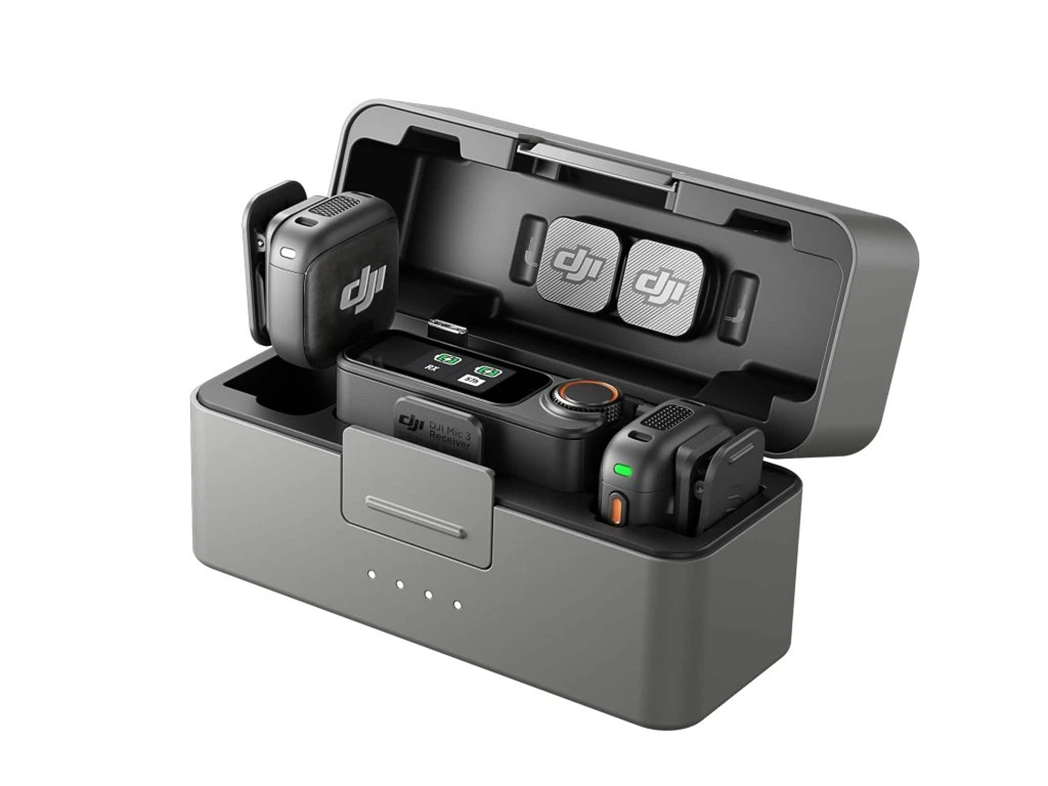 DJI Mic 3 prináša rovnaký robustný pocit, akým sa pýšil jeho predchodca, s masívnym nabíjacím puzdrom. Vpredu je pevná západka, ktorá ho udrží zatvorené počas prepravy podobne ako jeho predchodcu, pod ňou sú štyri biele LED diódy, ktoré slúžia na indikáciu priebehu nabíjania batérie, keď je zariadenie zapojené do portu USB-C umiestneného vzadu. Puzdro je v testovanej verzii 2TX o niečo väčšie, než by muselo byť, čo je užitočné, pretože vo veku je priestor na uloženie malých magnetov používaných na upevnenie mikrofónu na oblečenie, a ak si to neželáte, netreba odstraňovať ochranu proti vetru („mačičku“) z hornej časti mikrofónu/vysielača (TX) pri vkladaní do puzdra. Upevňovacie klipsy sú na rozdiel od Mic mini, ktorý je rozmerovo podobný, uchytené iba na magnete, ktorý je v puzdre mikrofónu, a ak ich nepotrebujete, dáte ich dole a používate mikrofón iba s prídavným magnetom. Je to praktickejšie riešenie, navyše tým predchádzate strate „drahocenných“ magnetov. Drahocenných preto, že DJI ich naposledy ako náhradný diel ponúkal k prvej generácii DJI Mic a odvtedy ich nedostať.