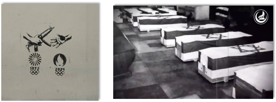 Obrázok graffiti údajne z Paríža, ktoré hrozí zopakovaním teroristických útokov z Mníchova 1972 počas nadchádzajúcich olympijských hier (vľavo). Obrázok so záberom z teroristickej hrozby pod falošnou vlajkou, údajne od tureckej ultranacionalistickej skupiny Siví vlci, ktorej symbol je viditeľný v pravom hornom rohu obrazovky. Video bolo masívne šírené proruskými botovými účtami a vyvolalo reakciu Izraelského olympijského výboru (vpravo).