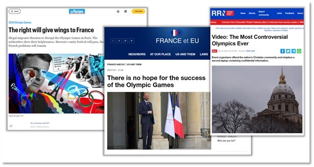 Olympijské hry v Paríži 2024, ktoré budú prebiehať od 26. júla do 11. augusta 2024, budú najväčším podujatím, aké kedy Francúzsko organizovalo. Paríž navštívi ročne približne 50 miliónov turistov, Olympijské hry však iba počas dvoch týždňov športového zápolenia plánujú pritiahnuť 10 miliónov návštevníkov. Spoločnosť Microsoft pozoruje hneď niekoľko ruských aktérov vplyvu, ktorých označuje ako Storm-1679 a Storm-1099, ktorí od júna 2023 presmerovali svoje vplyvové operácie tak, aby sa zamerali na olympijské hry. Svoje poznatky Microsoft podrobne opísal v špeciálnej správe Microsoft Threat Intelligence: „Ruské snahy o ovplyvňovanie sa sústreďujú na Olympijské hry 2024 v Paríži“.