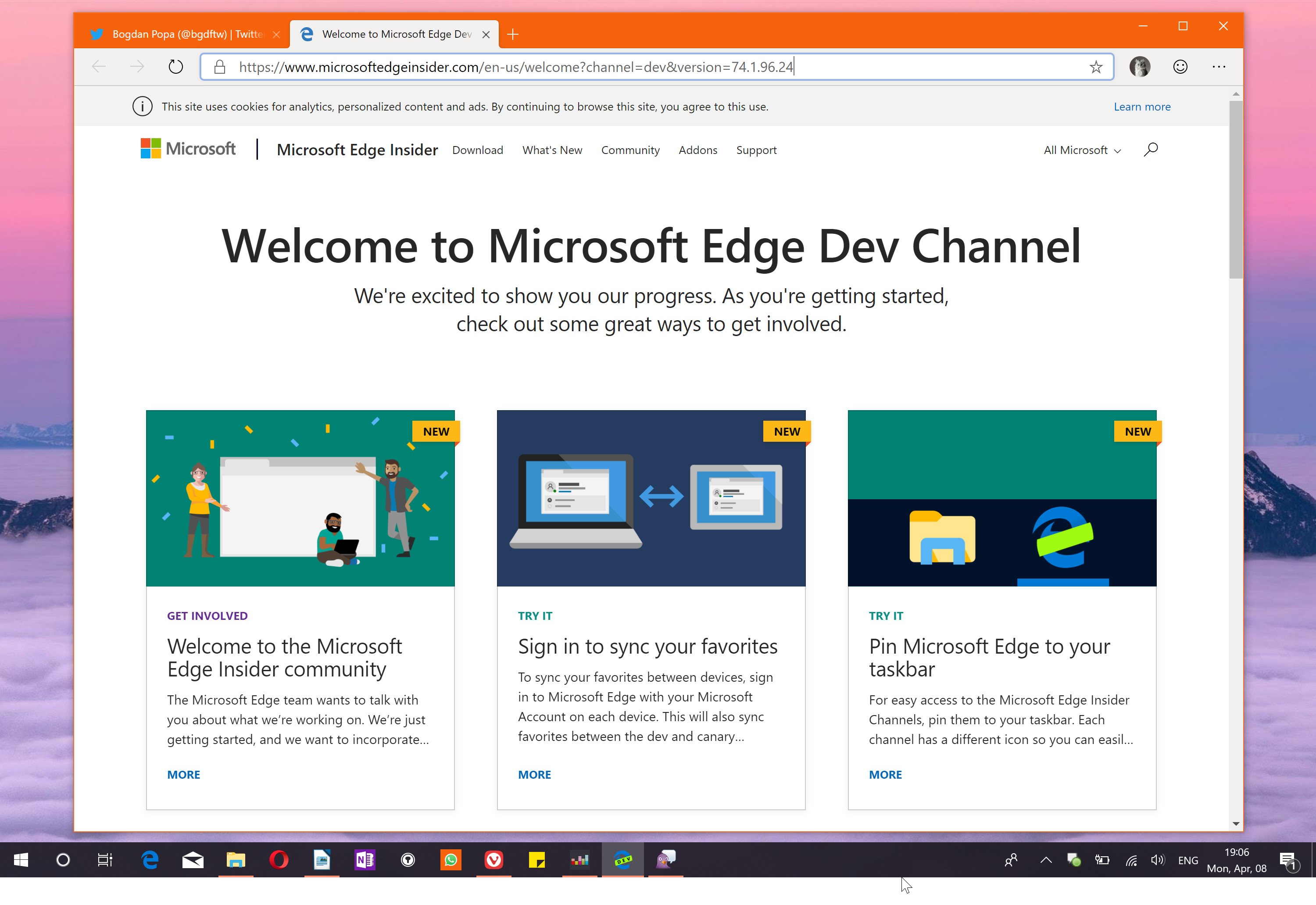 Microsoft sprístupnil vývojárom prehliadač Edge s jadrom Chromium. Spoločnosť uviedla dve zostavenia – Canary a Developer. Prvé má denný cyklus vydávania aktualizácií, druhé týždenný. Obidve zostavenia sú k dispozícii na webovej stránke Edge Insider a sú určené pre vývojárov, „skorých osvojiteľov“ a nadšencov, nie pre bežných používateľov.