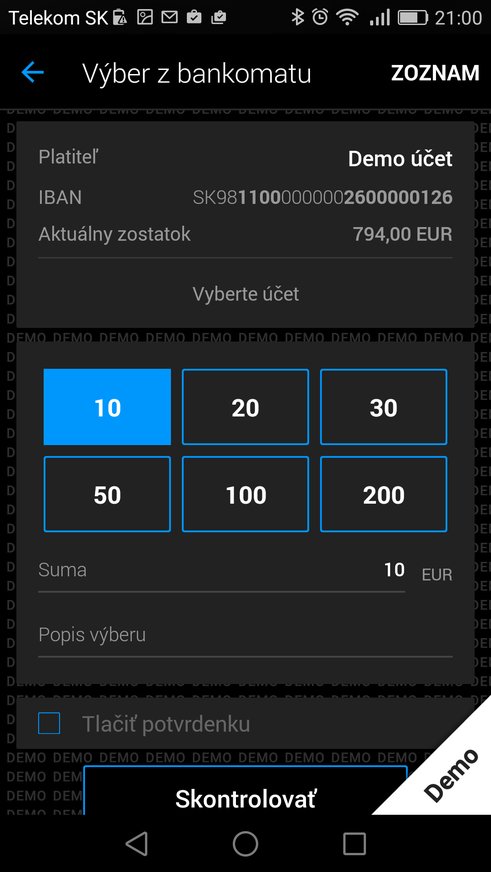 Postup je jednoduchý, stačí sa prihlásiť do aplikácie, zvoliť funkciu Výber z bankomatu, zadať sumu, môžete zvoliť účet, z ktorého chcete hotovosť vybrať, tlač potvrdenky z bankomatu a vlastnú poznámku, podľa ktorej budete vy a v prípade potreby aj banka vedieť výber identifikovať v zozname pohybov. Aplikácia zobrazí unikátny šesťmiestny kód, ktorý zadáte na klávesnici do bankomatu. Jeho platnosť je dvadsať minút, takže parametre výberu si môžete nastaviť vopred doma alebo cestou k bankomatu. Jednorazový a denný limit pri tomto druhu výberu je 200 eur.