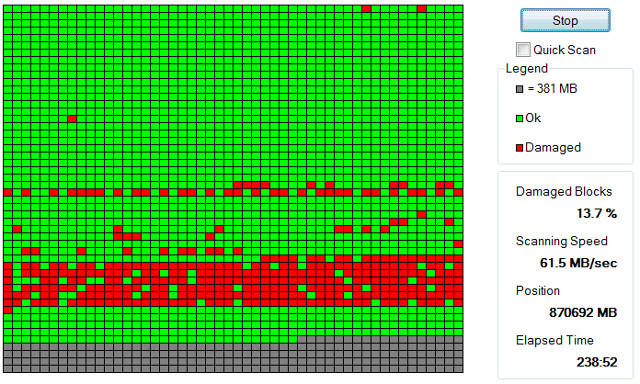 Blížiacu sa pohromu môže spôsobiť i pomaly umierajúci disk, dôvodov môže byť hneď niekoľko. Zvyčajne vznikajúcimi a nabaľujúcimi sa chybnými blokmi, ktoré môžete jednoducho objaviť cez plnohodnotné (t. j. nie quick scan) skenovanie povrchu platní v HD Tune. V záložke Health vás možno nemilo prekvapí i SMART, napríklad s množstvom premapovaných sektorov. Najhrozivejší je status failed. Pozornosť však zbystrite už pri hlásení warning, ak vám na vašich dátach záleží, akútne ich zálohujte alebo, čo je ešte lepšie, dosluhujúci disk nahraďte.