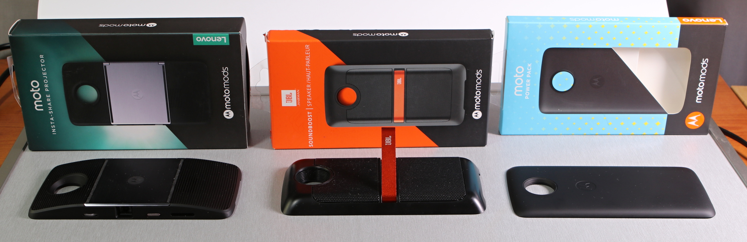 Ak potrebujete silnejšiu batériu, lepší reproduktor či fotoaparát, prípadne ak chcete prezentovať alebo pozerať multimediálny obsah s priateľmi na veľkej zobrazovacej ploche, stačí si na daný účel dokúpiť rozširujúci modul a jediným pohybom ho nasadiť na zadnú stenu smartfónu, kde je magnetický konektor. K dispozícii je aj modul s ovládacími prvkami ako na hernej konzole a ponuka modulov sa určite bude ďalej rozširovať. Najatraktívnejší (a najdrahší) je modul fotoaparátu Hasselblad True Zoom s rozlíšením 12 Mpx, 10-násobným optickým zoomom a xenónovým bleskom. Projektor Moto Insta-Share Projector má svietivosť 50 lm, kontrastný pomer 400:1 a premietne obraz s maximálnou uhlopriečkou 70". Svetelnosť projektora dosahuje 50 lm a kontrastný pomer je až 400:1.
