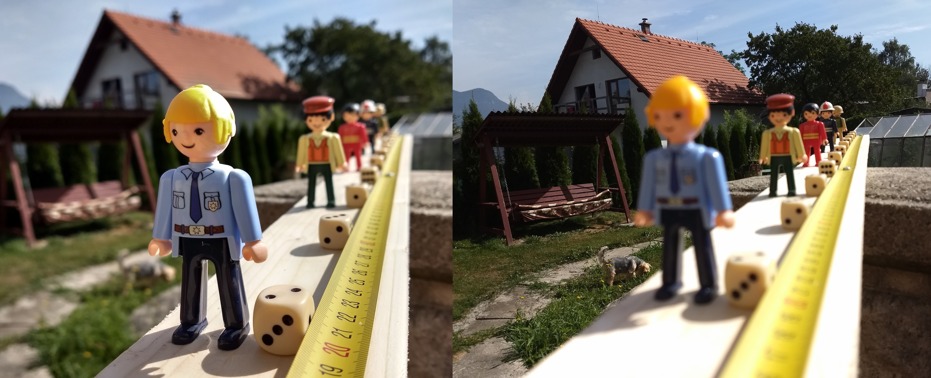 Porovnanie hĺbky ostrosti pri zaostrení na popredie (vľavo) a na pozadie (vpravo)
