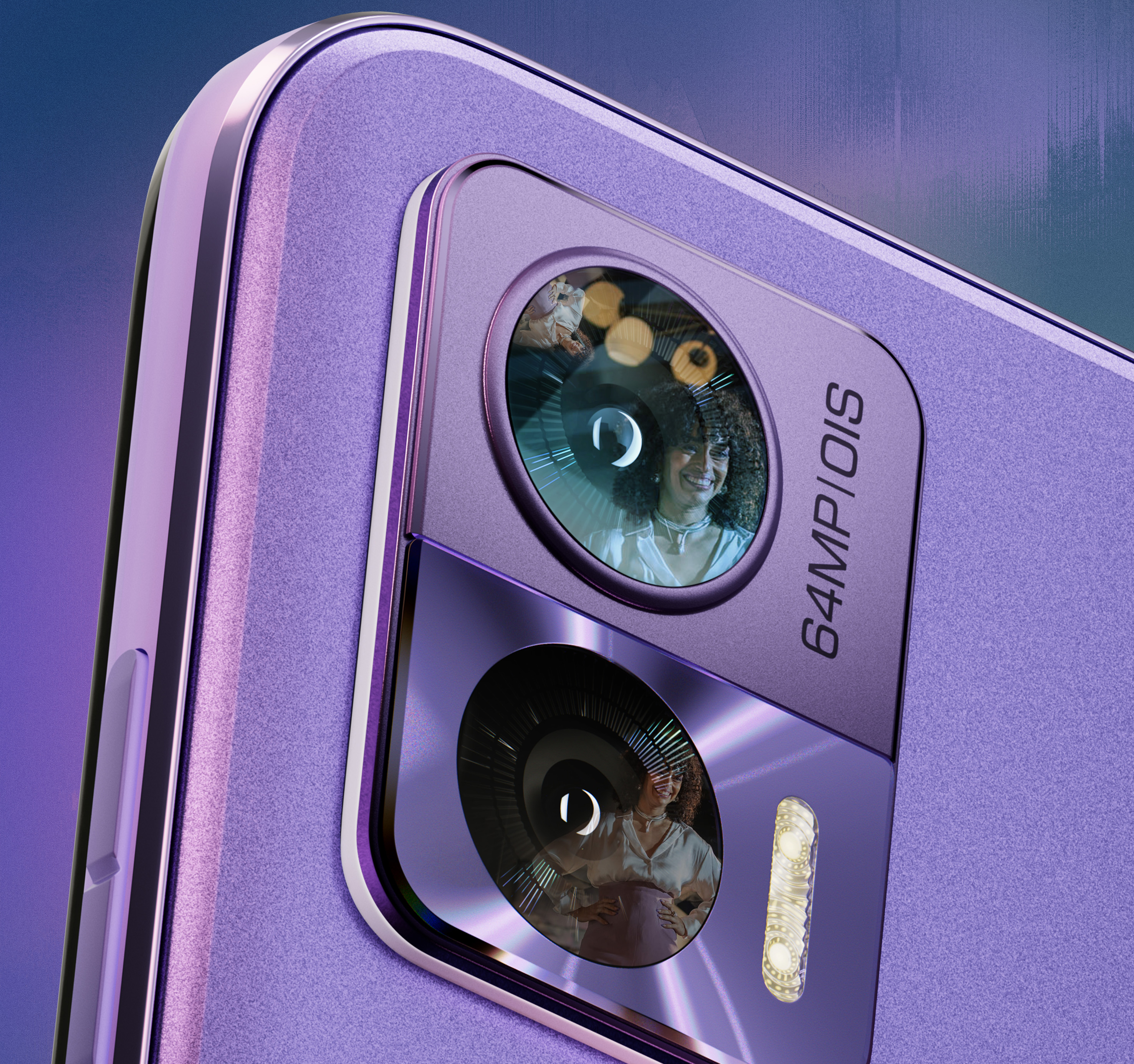 Systém hlavného fotoaparátu je mierne vystúpený a je rozdelený na dve časti: v jednej sa nachádza hlavný 64 Mpx fotoaparát a v druhej 13 Mpx širokouhlý/makro fotoaparát a LED blesk. Hlavný fotoaparát využíva technológiu Quad Pixel na zlepšenie citlivosti pri fotení v slabšom svetle a je vybavený optickou stabilizáciou obrazu. Celú oblasť obklopuje biely LED pásik, ktorý slúži na notifikácie. Je to príjemná funkcia, ktorú najviac využijete, ak máte telefón položený displejom nadol. Selfie fotoaparát má malý otvor v strede hornej časti displeja a pracuje s rozlíšením 32 Mpx. Fotoaparáty poskytujú kvalitné výsledky aj pri slabšom svetle, to však neplatí o selfie kamere. Tu je obraz zaťažený nadmerným potláčaním šumu, je neostrý a rozmazaný. Za dobrého svetla sú výsledky uspokojivé. Najväčším hendikepom je maximálne full HD rozlíšenie videa. Reproduktor sa nachádza na spodnej hrane spolu s portom USB-C, priehradkou na dvojicu nano SIM kariet a mikrofónom. Obe SIM karty môžu byť pripojené na 5G.