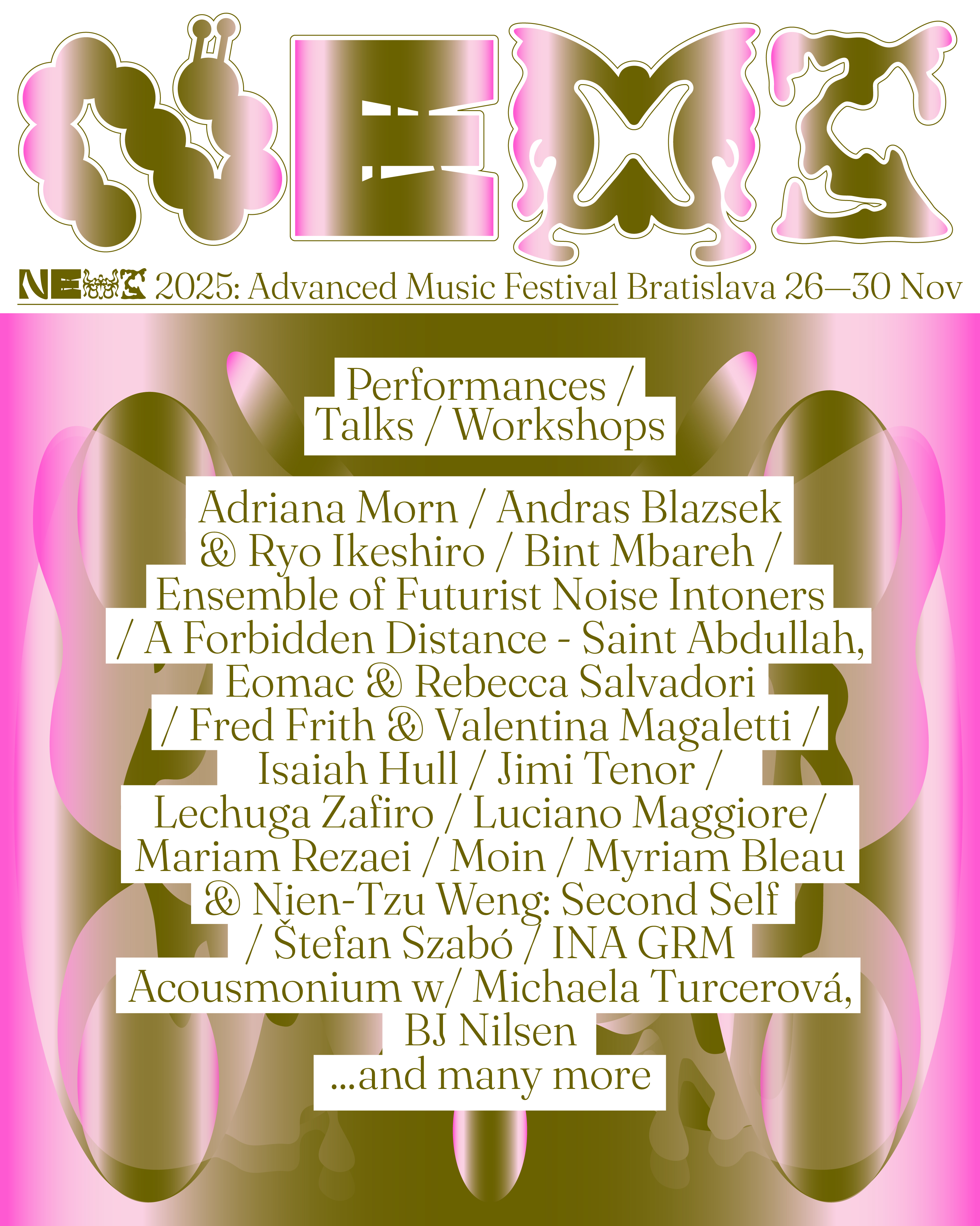 Vo štvrtok 27. novembra bude ústredným bodom večera slovenská premiéra audiovizuálneho diela Second Self, v ktorom Myriam Bleau a taiwansko-kanadská choreografka Nien Tzu Weng skúmajú zrkadlové obrazy identity prostredníctvom LED protéz, pohybu a digitálneho zvuku. Gitarista a skladateľ Fred Frith, žijúca legenda improvizovanej hudby sa spojí s perkusionistkou Valentinou Magaletti v novej spolupráci, ktorá vznikla na objednávku NEXTu. Medzinárodný súbor Ensemble of Futurist Noise Intoners rozozvučí rekonštruované futuristické nástroje intonarumori v nových dielach mladej generácie skladateliek ako Aleksandra Gudkova a Eva Sajanová, a program doplní večný fínsky experimentátor Jimi Tenor. O klubový aftercare sa v špeciálnom kazetovom DJ sete postará Snediggen Snurssla v A4 Kafé.