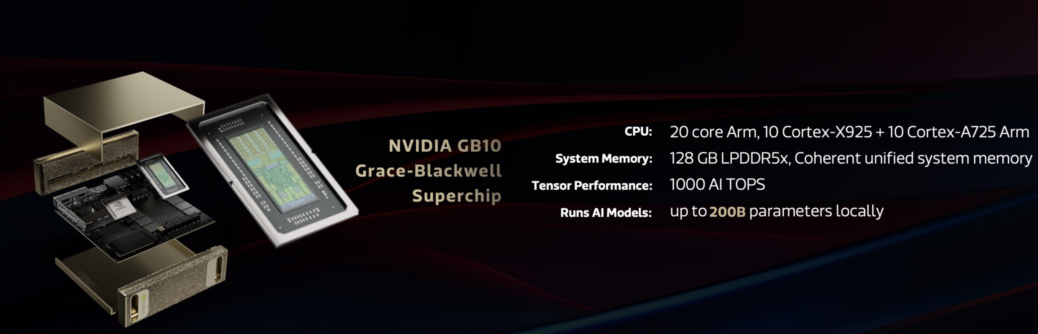 Srdcom systému je špičkový dvadsaťjadrový procesor NVIDIA GB10 (10 jadier Cortex-X925 + 10 jadier Cortex-A725) s architektúrou optimalizovanou pre AI workloady, podporovaný rýchlou operačnou pamäťou s kapacitou až 128 GB DDR5. Unikátna architektúra GB10 Grace Blackwell Superchip spája Arm CPU a výkonnú Blackwell GPU so 128 GB jednotnej pamäte, zdieľanej medzi CPU a GPU bez tradičného rozdelenia RAM a VRAM. To umožňuje efektívnejšiu prácu s veľkými modelmi AI a eliminuje úzke dátové hrdlá, ktoré trápia klasické AI PC zostavy.