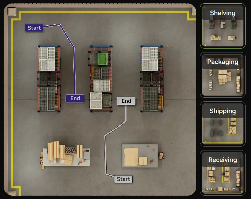 Test Multi-Robot Fleets for Industrial Automation umožňuje simulovať, testovať a optimalizovať fyzickú flotilu AI robotov vo veľkom meradle v priemyselných digitálnych dvojičkách pred nasadením v reálnom svete. Workflow umožňuje konfigurovať autonómne mobilné roboty (AMR) a simulovať ich pohyby v skladovom prostredí.