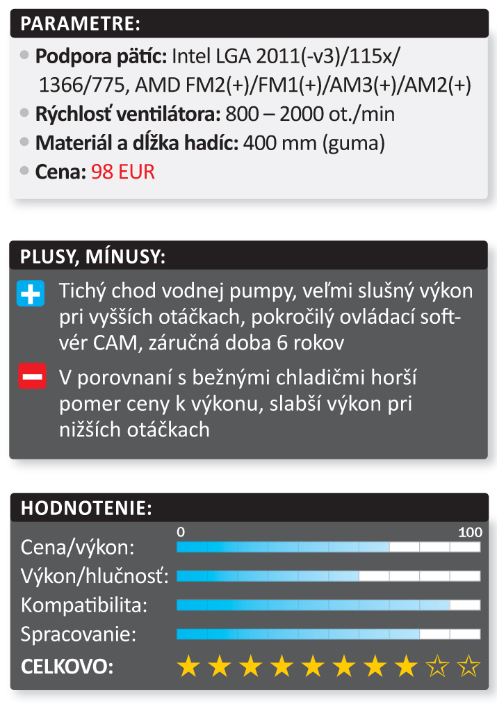 Okrem toho, že „vodník“ pôsobí atraktívnejším dojmom než bežné chladiče, čo je i dôvod celkom slušného záujmu oň, sú situácie, v ktorých aj napriek všetkým neduhom – počnúc vrčiacimi čerpadlami až po hroziacu galvanickú koróziu – dávame zelenú i tomuto typu chladenia. Jeho výhoda je totiž v tom, že sa nízky blok dostane i tam, kde sa vysoký a účinný chladič už nezmestí.