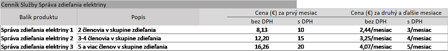 - Za službu Zdieľaná elektrina 1 s 2 členmi v skupine, bude účtovaný poplatok 10 € s DPH za prvý mesiaca a následne za ďalšie mesiace bude poplatok v cene 3 € s DPH.