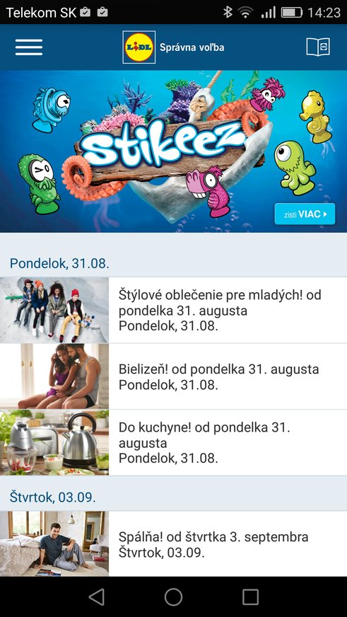 Pri orientácii v aktuálnej ponuke aj pripravovaných akciách vám pomôže mobilná aplikácia, ktorá je k dispozícii pre platformy Android a iOS. Aplikácia vám v porovnaní s webom cez prehliadač na mobilnom zariadení poskytuje rýchlejší a intuitívnejší prístup k všetkým dôležitým informáciám, ako aj možnosť filtrovania a individuálneho výberu. Tovar je prehľadne tematicky kategorizovaný a pri jednotlivých položkách je vždy informácia o cene a dostupnosti v predajni. Akciový tovar sa predáva vždy v pondelok a vo štvrtok a lukratívne či cenovo výhodné položky sa spravidla vypredajú veľmi rýchlo.