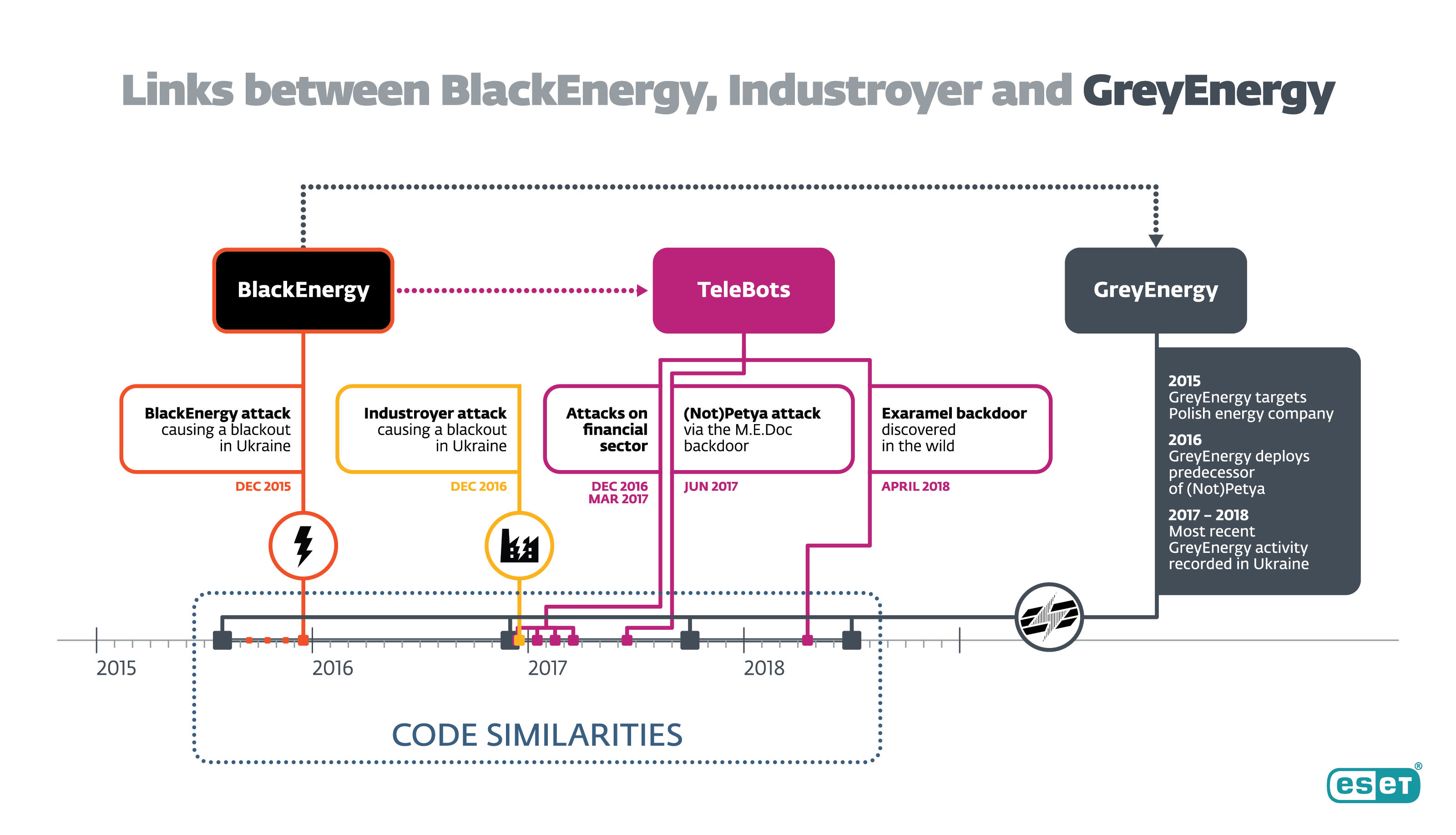 Útok na ukrajinskú energetickú infraštruktúru v roku 2015 bol zatiaľ poslednou známou operáciou, pri ktorej bol škodlivý kód BlackEnergy použitý. Nová podskupina s názvom TeleBots je známa pre globálny dopad škodlivého kódu NotPetya, ktorý v roku 2017 premazával obsah napadnutých zariadení, narušil chod globálnych firiem a spôsobil škody v hodnote miliárd dolárov. Skupina TeleBots je prepojená aj na Industroyer, najsilnejší moderný škodlivý kód zameriavajú ...