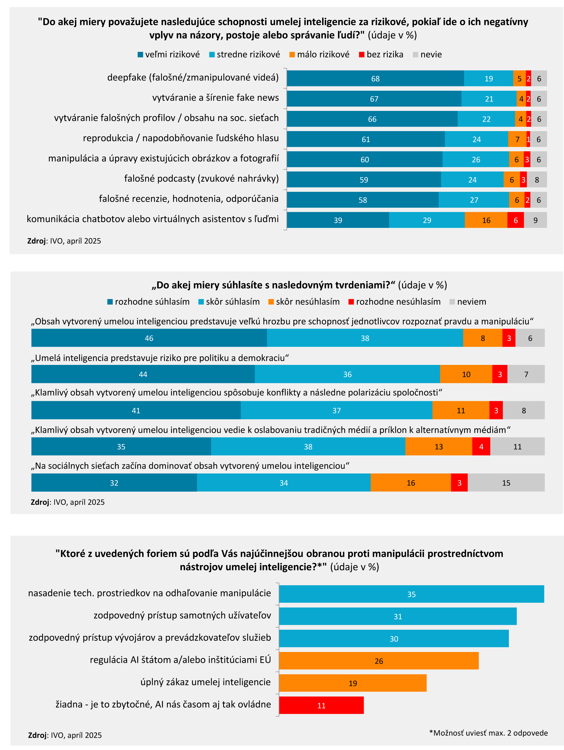 „Uvedomenie si miery rizika spojenej so schopnosťami umelej inteligencie manipulovať s verejnou mienkou a správaním je konzistentné aj so všeobecnými postojmi k vplyvu AI na spoločnosť. Napríklad až 84% respondentov súhlasí s názorom, že obsah vytvorený umelou inteligenciou predstavuje veľkú hrozbu pre schopnosť jednotlivcov rozpoznať pravdu a manipuláciu. Pre rovnako veľkú časť (80%) predstavuje AI riziko pre politiku a demokraciu – napr. jej zneužívaním na ovplyvňovanie volieb, verejnej mienky, manipulovanie a falšovanie vyjadrení politikov, šírenie propagandy a pod. Viac ako tri štvrtiny (78%) respondentov súhlasia aj s logickým dôsledkom a to, že klamlivý obsah vytvorený umelou inteligenciou spôsobuje konflikty a následne polarizáciu spoločnosti“, hovorí analytik IVO Marián Velšic.