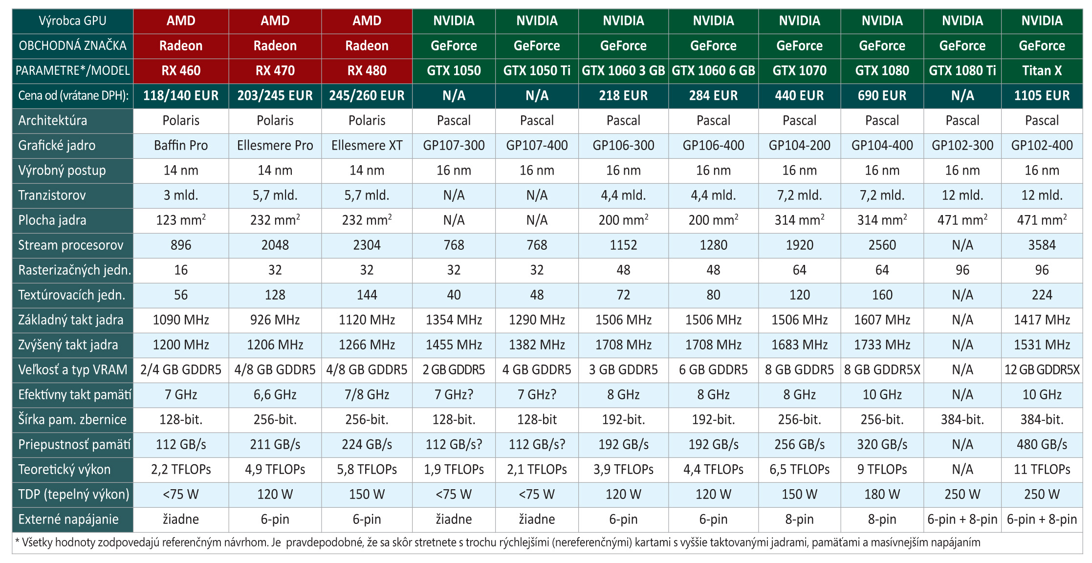 Plynulo prejdeme od najlacnejších po najdrahšie karty. Početne má v tejto chvíli navrch nVidia, ktorá ich má takmer trikrát toľko a zrejme už i kompletné portfólio. AMD niekoľko modelov do obehu ešte len pošle – najviac sa momentálne skloňuje piata revízia architektúry GCN – GFX9, nazývaná Vega, o nej však až neskôr.