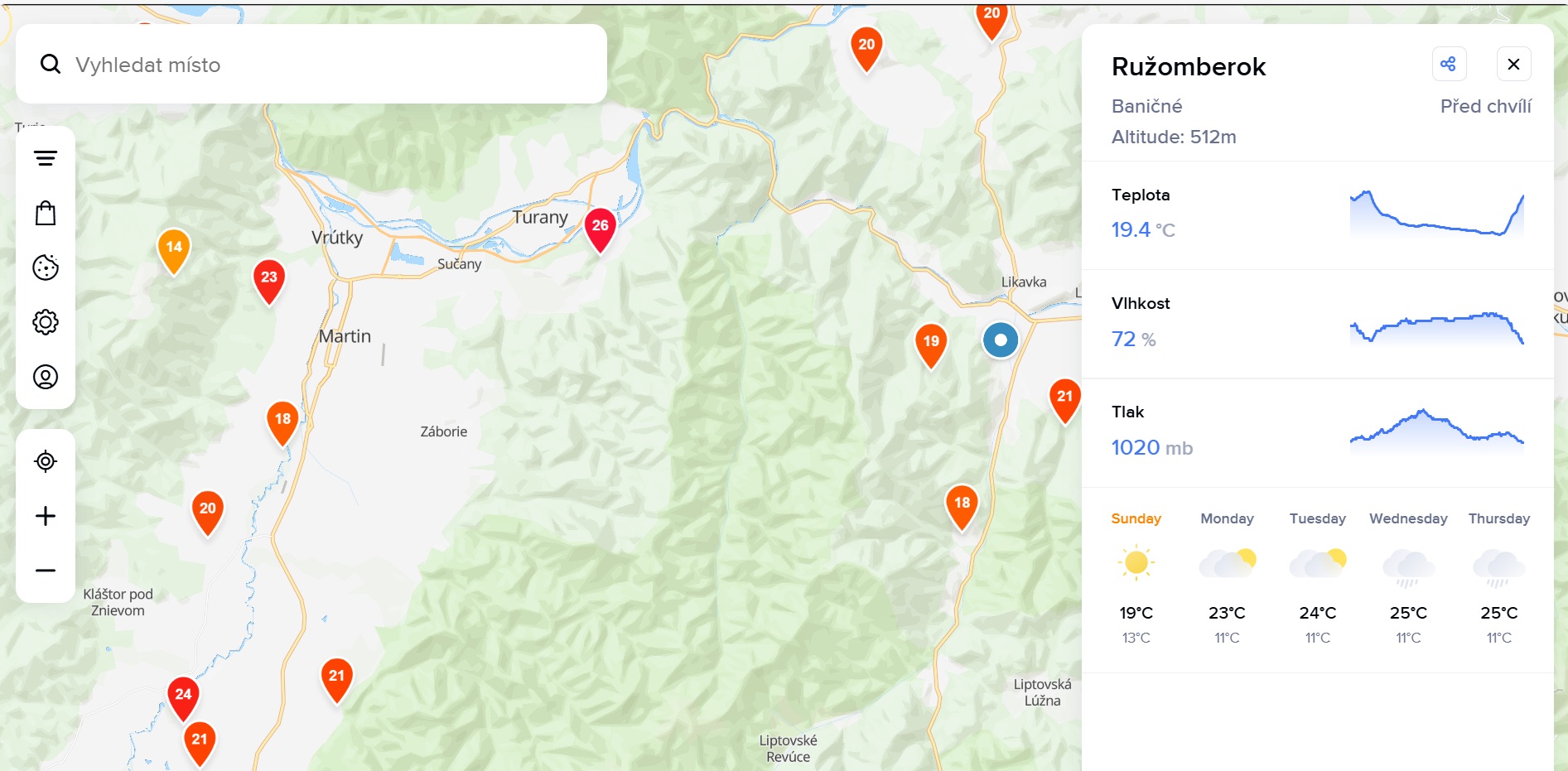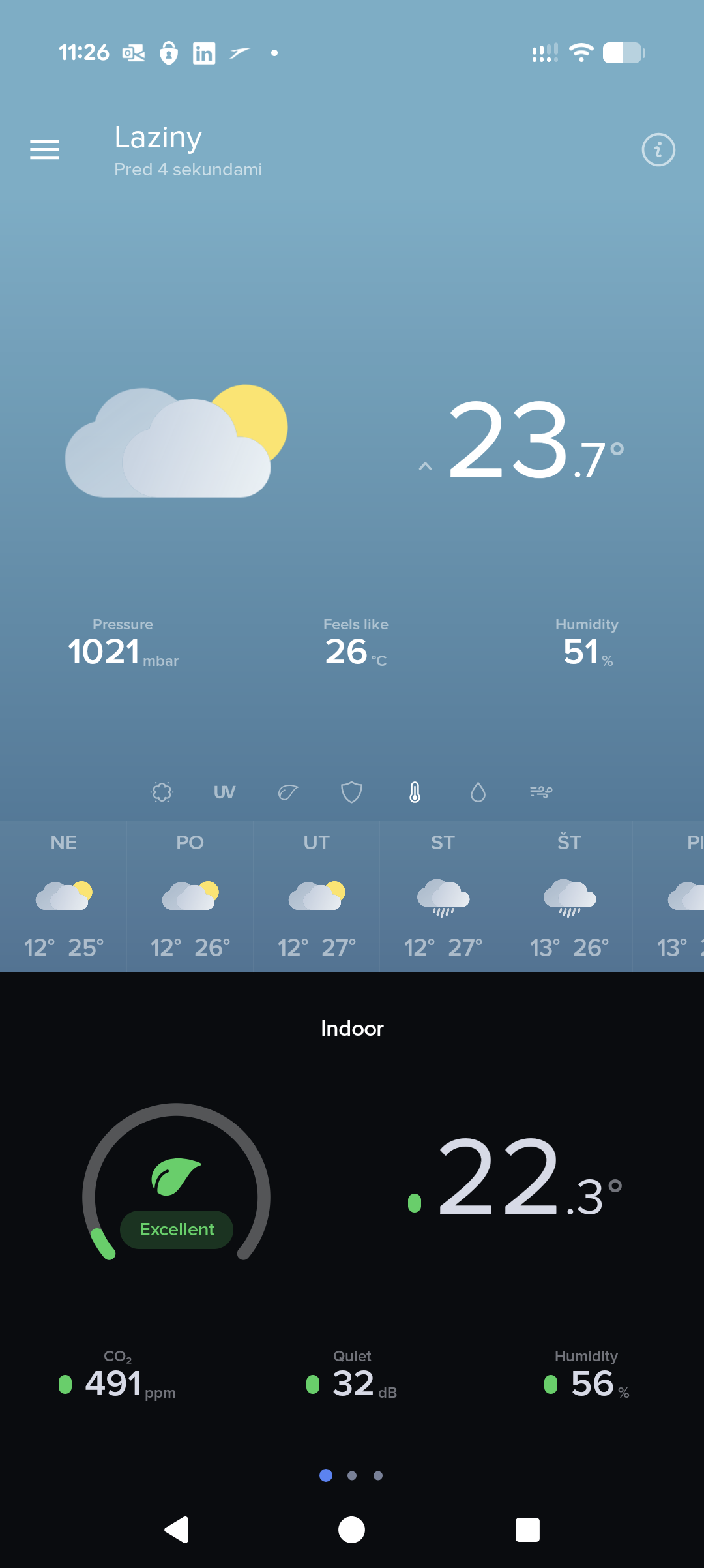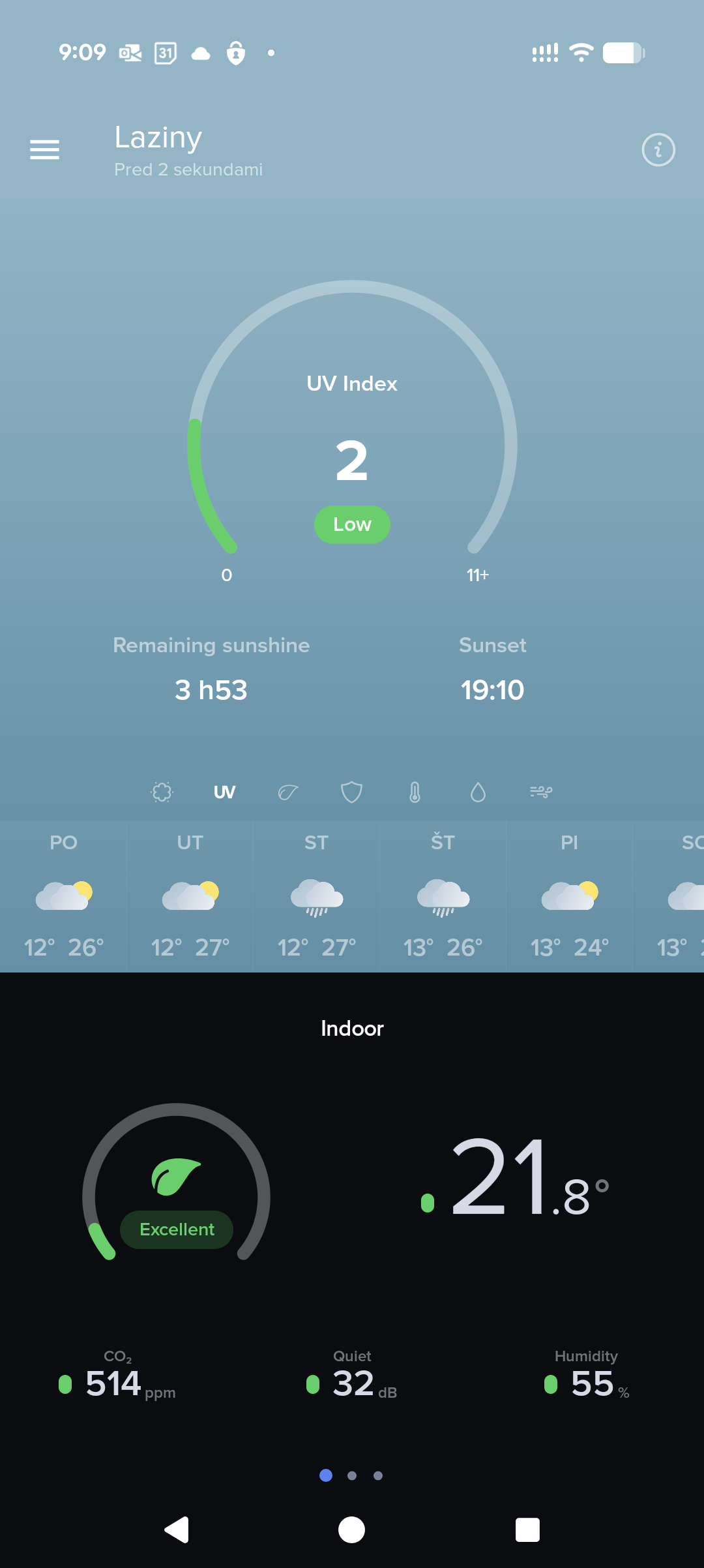 V hornej časti okna aplikácie je zobrazená aktuálna teplota, vlhkosť a barometrický tlak, spolu s predpoveďou na 7 dní, ktorú aplikácia získava pre vašu lokalitu z meteorologického servera.