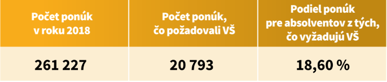 Analýza Profesie ukazuje, že iba 8 percent z celkového počtu ponúk vyžaduje vysokoškolské vzdelanie 2. stupňa. V roku 2018 bolo na najväčšom portáli na Slovensku uverejnených vyše 261-tisíc pracovných ponúk.