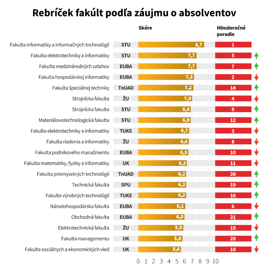 Firma Profesia zostavila rebríček verejných vysokých škôl a fakúlt už po 12. raz. Umiestnenie závisí od toho, koľko zamestnávateľov si prehliada životopisy absolventov, ktoré boli uverejnené na pracovnom portáli Profesia.sk. Rebríček tak nehodnotí úroveň vyučovania, ale zameriava sa na uplatnenie jednotlivých absolventov na trhu práce.