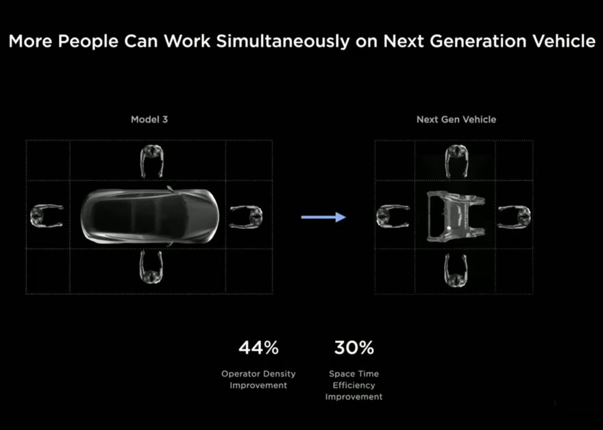 Na nedávnej prezentácii odhalil viceprezident spoločnosti Lars Moravy novú zaujímavú výrobnú techniku, ktorá zvyšuje produkciu na montážnej linke. Problém s tradičnou výrobou na montážnej linke je v tom, že po zložení karosérie sa do nej a okolo nej zmestí len určitý počet ľudí, aby namontovali komponenty, čo všetko spomaľuje. Okrem toho sa plytvá veľa času a energie, keďže 5-metrové vozidlo sa musí presúvať z jedného stanovišťa na druhé. Tesla teda pracuje na tejto „rozbalenej“ (unboxed) metóde. V podstate ide o rozloženie auta na podzostavy, z ktorých každú zostaví vlastný tím samostatne a dokonca ju aj nalakuje.