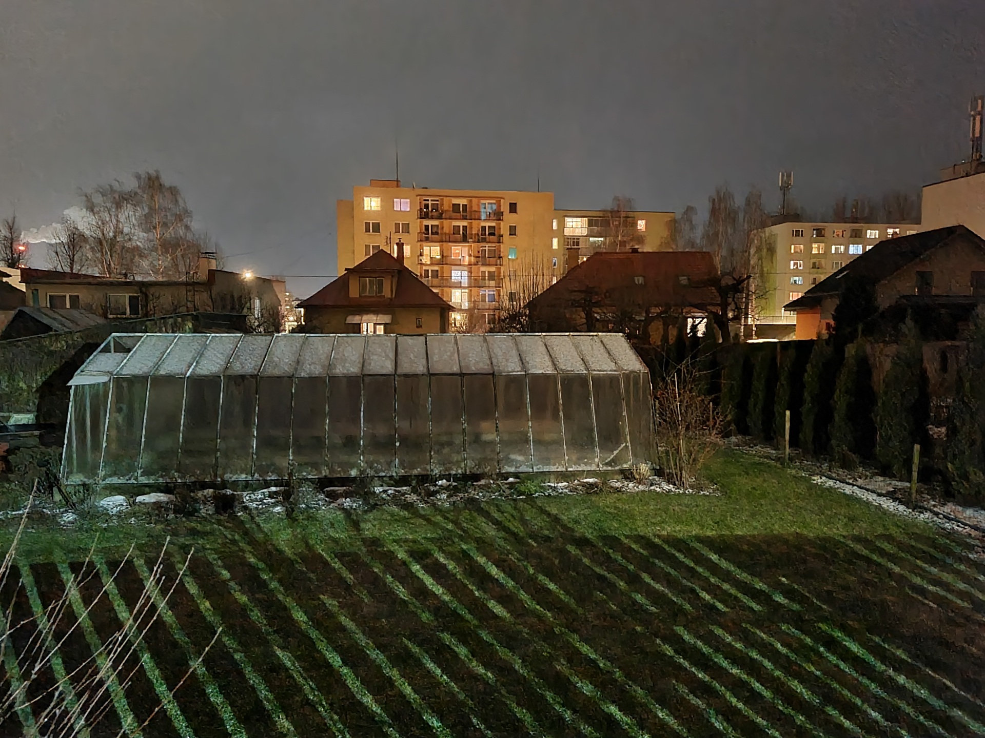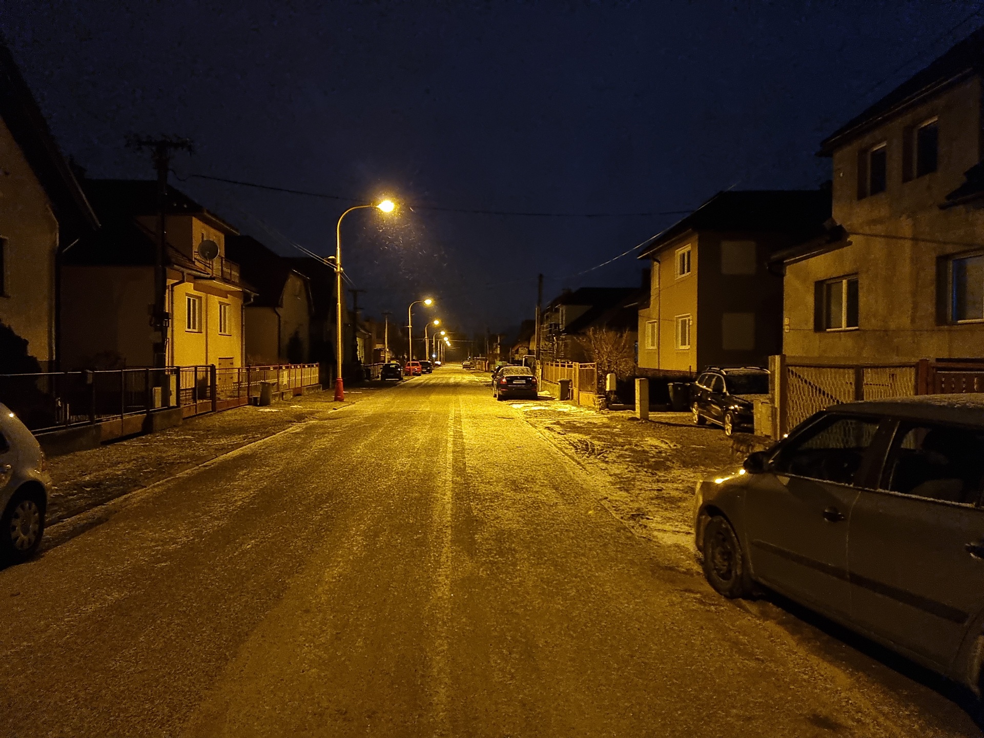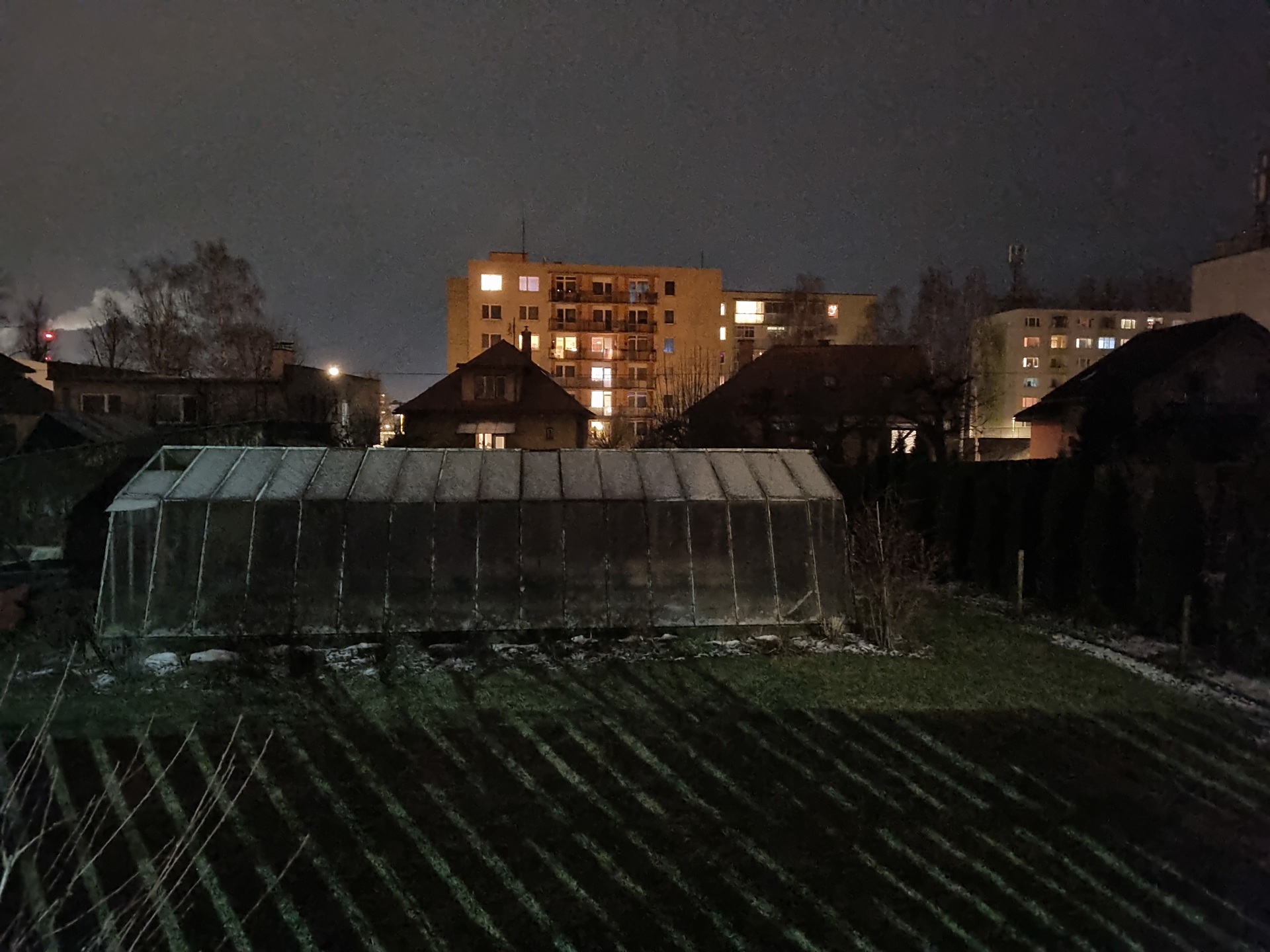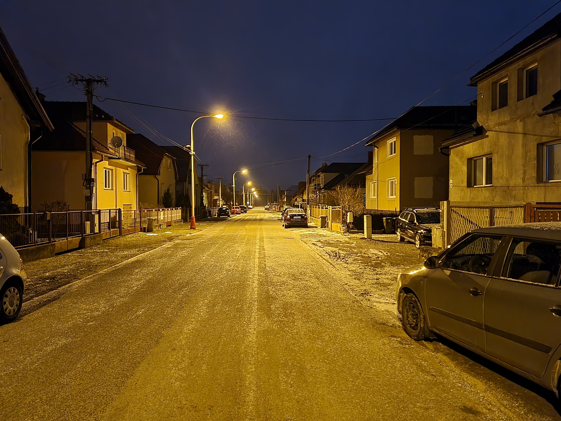 Pri fotení v horších svetelných podmienkach expozičná automatika uprednostňuje kratšiu expozičnú dobu, a to aj za cenu vyššieho ISO, ktorého sprievodným javom je farebný šum. Umelá inteligencia síce dokáže eliminovať chvenie rúk pri dlhšej expozícii, ale to umožňuje ostré zábery len pri statických scénach. Len čo je v zábere pohyb, riešením je jedine kratší expozičný čas. Podľa mojich skúseností odporúčam pri fotení večer a v noci zapnúť nočný režim. Zábery budú mať väčšiu jasovú aj farebnú dynamiku.