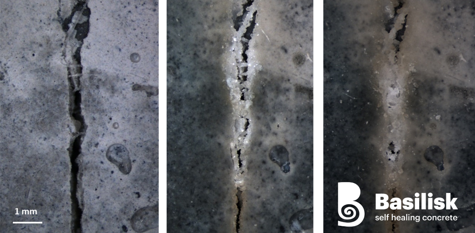 Na americký trh bol uvedený nový typ samoopravného betónu. Nazýva sa Basilisk Self-Healing Concrete a svoje samoscelivé vlastnosti získava z baktérií, ktoré sú doň primiešané. Tieto baktérie potom pri sceľovaní betónu produkujú nový vápenec, ktorý umožňuje úplne uzavrieť trhliny bez toho, aby bolo treba znovu nanášať betón. Existuje niekoľko dôvodov, prečo betón Basilisk ponúka výhodu pre konštrukcie, do ktorých je umiestnený.