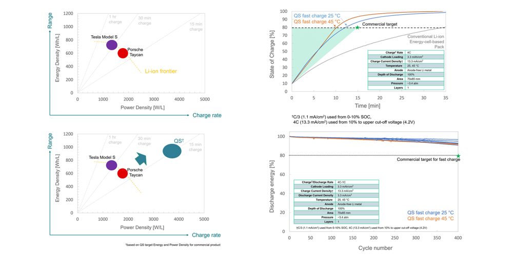 Spoločnosť QuantumScape zverejnila nové údaje o vývoji svojich polovodičových batérií, ktorých články uskutočnili 400 po sebe idúcich 15-minútových cyklov rýchleho nabíjania, čím sa doplnila kapacita z 10 % na 80 %. Pritom si zachovali viac ako 80 % pôvodnej kapacity. QuantumScape verí, že tento typ batériovej technológie ako prvý v histórii dokáže skrátiť čas nabíjania elektromobilov na niekoľko minút, čo pomôže podporiť ďalšie zavádzanie elektrických vozidiel. Spoločnosť bola založená v roku 2010 s cieľom vyvinúť škálovateľné a efektívne polovodičové batérie.