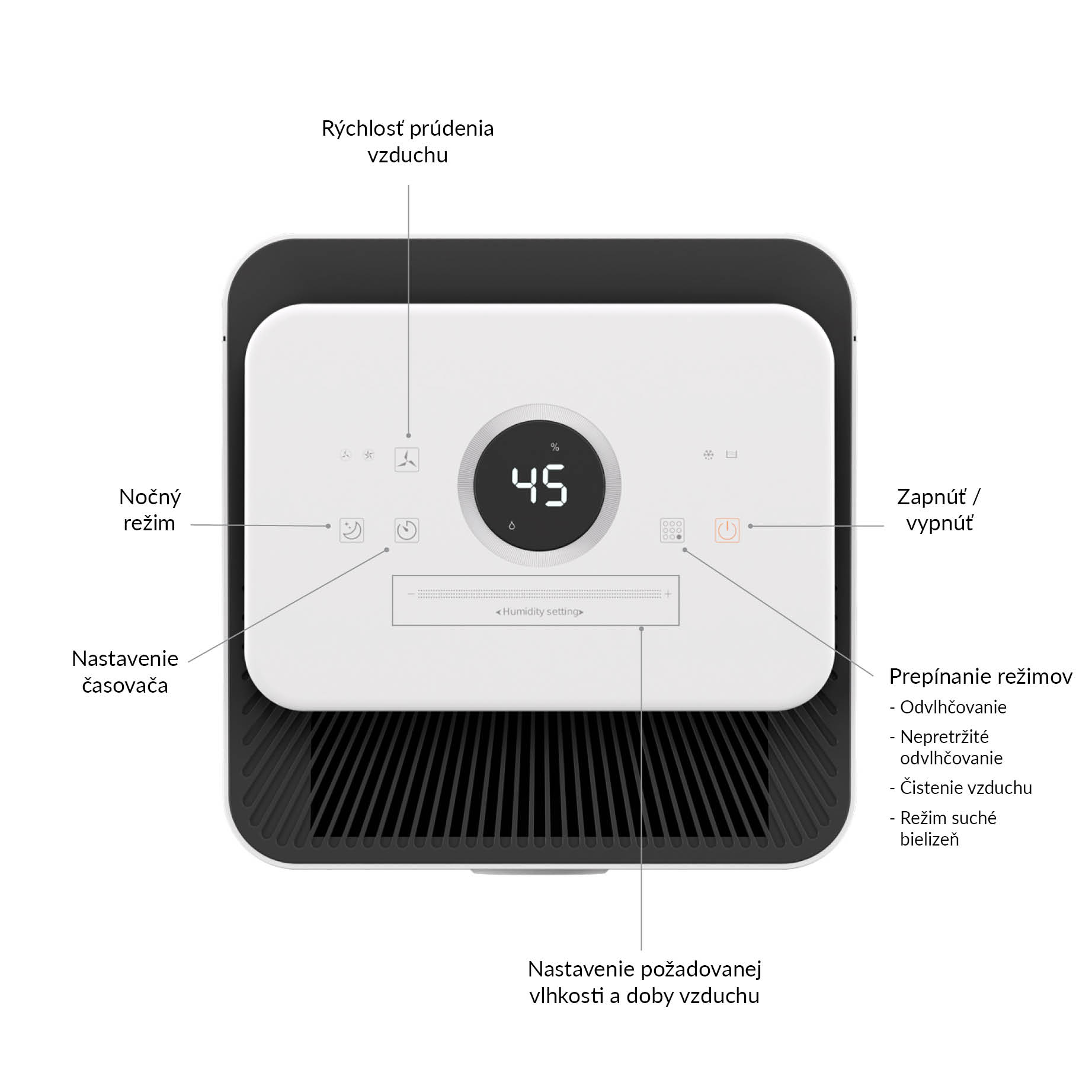 Odvlhčovač sa ovláda pomocou dotykového displeja a má aj funkciu časovača a nočného režimu. monitoruje hodnoty vlhkosti vzduchu v miestnosti, ktorú zobrazuje na displeji. Pomocou tlačidla je možné nastaviť ako rýchlo chcete aby vzduch odvlhčovačom prúdil. K dispozícii je aj špeciálny režim na sušenie prádla, ktoré inak vlhkosť vzduchu výrazne zvyšuje. Prádlo vám bude schnúť oveľa rýchlejšie Po založení filtra prístroj funguje aj ako čistička vzduchu, eliminuje víry a baktérie v ovzduší a zlepšuje jeho celkovú kvalitu.