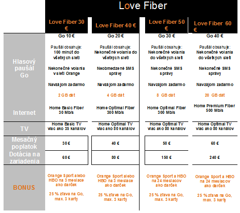 Nová konvergentná ponuka pod názvom Love Fiber je prirodzenou odpoveďou na vylepšenú televíziu, ako aj hlasových paušálov Go od Orangeu. Zákazníci v jednom balíku od jedného operátora môžu získať tú najlepšiu kombináciu mobilných aj fixných služieb, ktoré pokryjú potreby celej domácnosti za výhodné ceny a k tomu množstvo ďalších výhod.