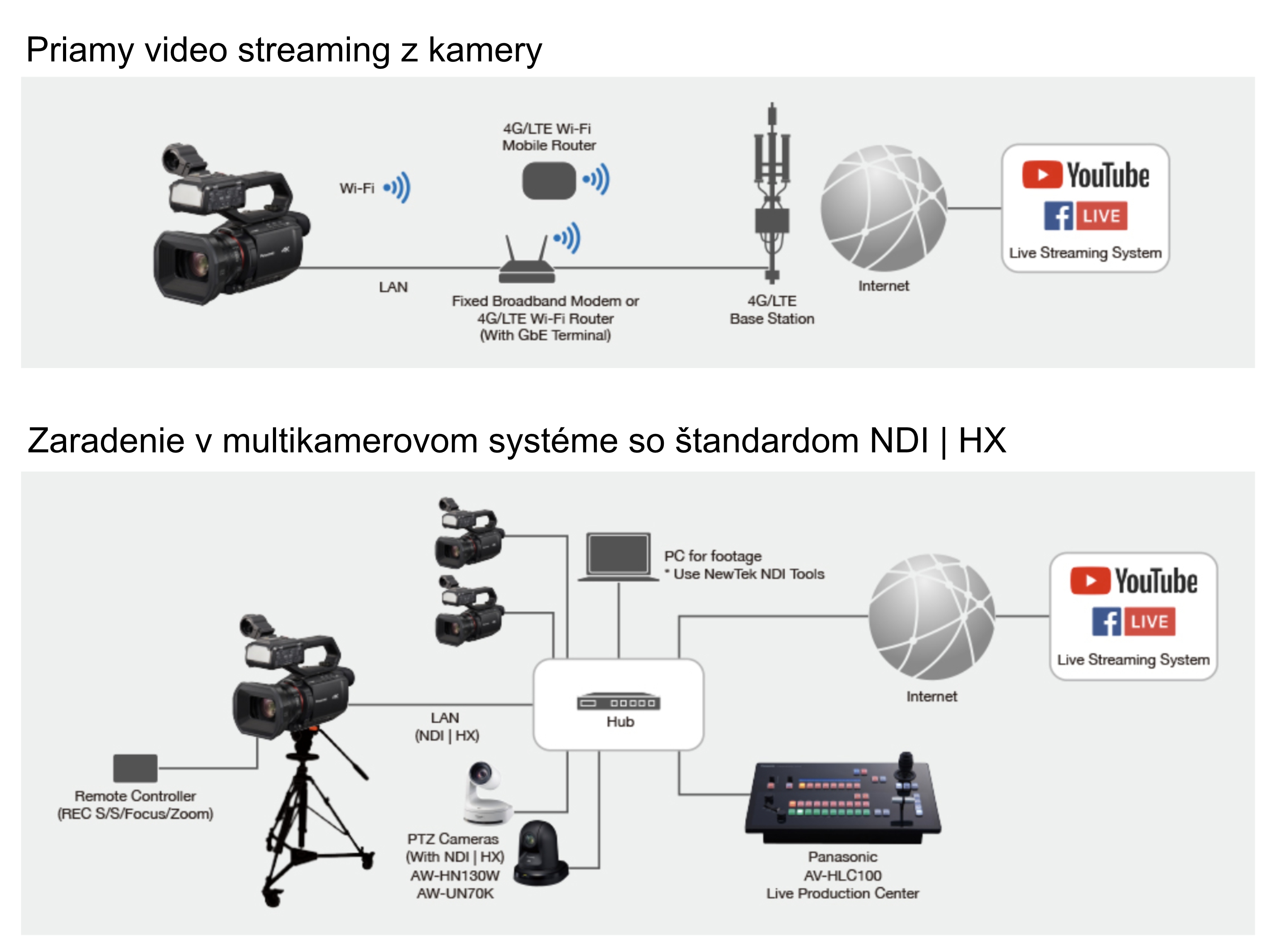 Panasonic reflektuje dnešné požiadavky na malé a výkonné prístroje. Kamera je určená predovšetkým na spravodajstvo, záznam rôznych podujatí a aj na streamovanie, v čase pandémie koronavírusu také populárne. Napriek malým rozmerom výrobca už tradične ponúka širokú ponuku funkcií a záznamových formátov. Kamera umožňuje interný záznam 4K 60p vrátane kompresie All Intra na jednoduchšie spracovanie v teréne. Okrem toho je k dispozícii interný záznam 4K 30p 4:2:2 10 bit alebo 4:2:0 10 bit v kodeku HEVC. Kamera pracuje s kompresnými schémami H.264, HEVC s kontajnermi MP4, MOV, AVCHD aj P2. Vďaka vstavanému Wi-Fi a pripojiteľnému USB-eternetovému portu kamera umožňuje aj priame streamovanie až do rozlíšenia FHD 60p protokolmi RTSP/RTP/RTMP/RTMPS, čo je veľmi zaujímavá funkčnosť. Možno veľmi elegantne a kvalitne streamovať dôležité udalosti či firemné prezentácie na YouTube, Facebook, Zoom a podobne. V tomto smere poslúži rozhodne lepšie ako rôzne náhradné riešenia s webovými kamerami, keď poskytne podstatne vyššiu kvalitu a aj značne serióznejší vzhľad. Interný záznam sa uskutočňuje na dvojicu kariet SDHC/SDXC alebo kariet micro P2 série A alebo B. Možný je, samozrejme, súčasný aj postupný záznam, ako aj súčasný záznam proxy súborov. Z výstupov tu okrem HDMI nájdete aj SDI vo verzii 3G/1.5G HD-SDI s maximálnym rozlíšením 1080 60p. Na rozdiel od väčších modelov má AG-CX10 kompaktnú konštrukciu s výklopným 3,5" displejom na ľavej strane. Objektív Leica Dicomar s ekvivalentným rozsahom 25-600 mm má premenlivú svetelnosť F1,8 – 4 a filtrový závit s priemerom 62 mm. Snímač MOS s rozmerom 1/2,5" má rozlíšenie 8,29 Mpx a 5-osovú hybridnú stabilizáciu. Objektív má mohutnú hranatú slnečnú clonu s odklápacím krytom. Na tubuse je dvojica prstencov, prvý patrí zaostrovaniu a druhým možno prepínať medzi zoomom a clonou. Za nimi je páčka ovládania trojstupňového ND filtra. Kamera má takisto vypínateľný IR filter. Ovládanie je zverené priamym tlačidlám najpoužívanejších funkcií spolu s otočným ovládačom voľby. Ovládať možno aj pomocou dotykového displeja. V zadnej časti sa nachádza výsuvný hľadáčik nastaviteľný nahor o 90°. Vysunutím hľadáčika alebo displeja sa kamera zapína, ak ju máte na statíve, možno ju vypnúť aj zapnúť tlačidlom pod displejom. Displej má dostatočný jas aj na prácu v exteriéri, pri silnom svetle možno veľmi dobre použiť hľadáčik s veľkou gumovou očnicou. Na tele je niekoľko ďalších tlačidiel s prednastavenými funkciami, ktoré si možno prispôsobiť podľa svojich preferencií, ďalšie funkcie si možno prednastaviť v rýchlom menu. Prístroj sa dodáva s odnímateľnou rukoväťou, ktorá okrem jednoduchého prenášania obsahuje aj zdvojené ovládanie zoomu a spúšte a v prednej časti zvukový panel s dvojicou terminálov XLR na mikrofóny. V čelnej časti je svetlo na reportážne video s plynulou reguláciou.