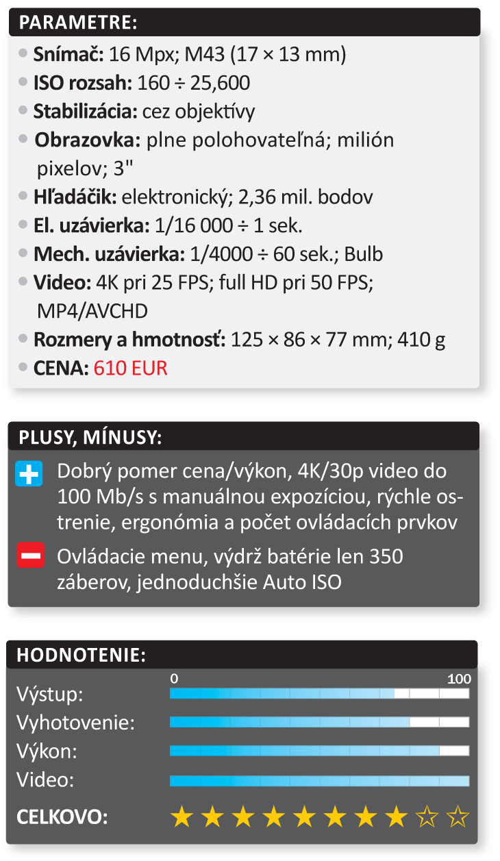 G7 je aj veľmi výkonný fotoaparát. Oproti svojim priamym konkurentom má len jedinú nevýhodu – snímače M43 sú na tom obrazovou kvalitou o máličko horšie než väčšie APS-C. Vynahradzujú to menším rozmerom objektívov, ktorých je na tento dvojsystém Panasonicu a Olympusu dostupných naozaj mnoho – od zábavných lacných až po profesionálne. A ani rozdiel v obrazovej kvalite nie je zásadný, my sme s G7 pokojne fotili v prítmí s ISO medzi 5000 a 8000 a obrázky nám vyšli veľmi použiteľné, a to aj na stredne veľkú tlač. Slabinou je skôr dynamický rozsah, teda snímanie veľmi kontrastných scén, kde dominujú väčšie snímače. Zato farebné podanie, expozícia aj rýchle a presné ostrenie s detekciou tváre a ostrením na bližšie oko, toto všetko funguje spoľahlivo. Voliť miesto ostrenia môžete dotykom na obrazovke dokonca aj pri pohľade cez hľadáčik, čo veľmi oceňujeme. Mimochodom, displej aj hľadáčik zobrazujú náhľad rýchlosťou 60 FPS s nepostrehnuteľným oneskorením. Maximálna rýchlosť snímania pri plnom rozlíšení je úctyhodných 7 FPS, čo je dosť aj na športovejšie použitie.