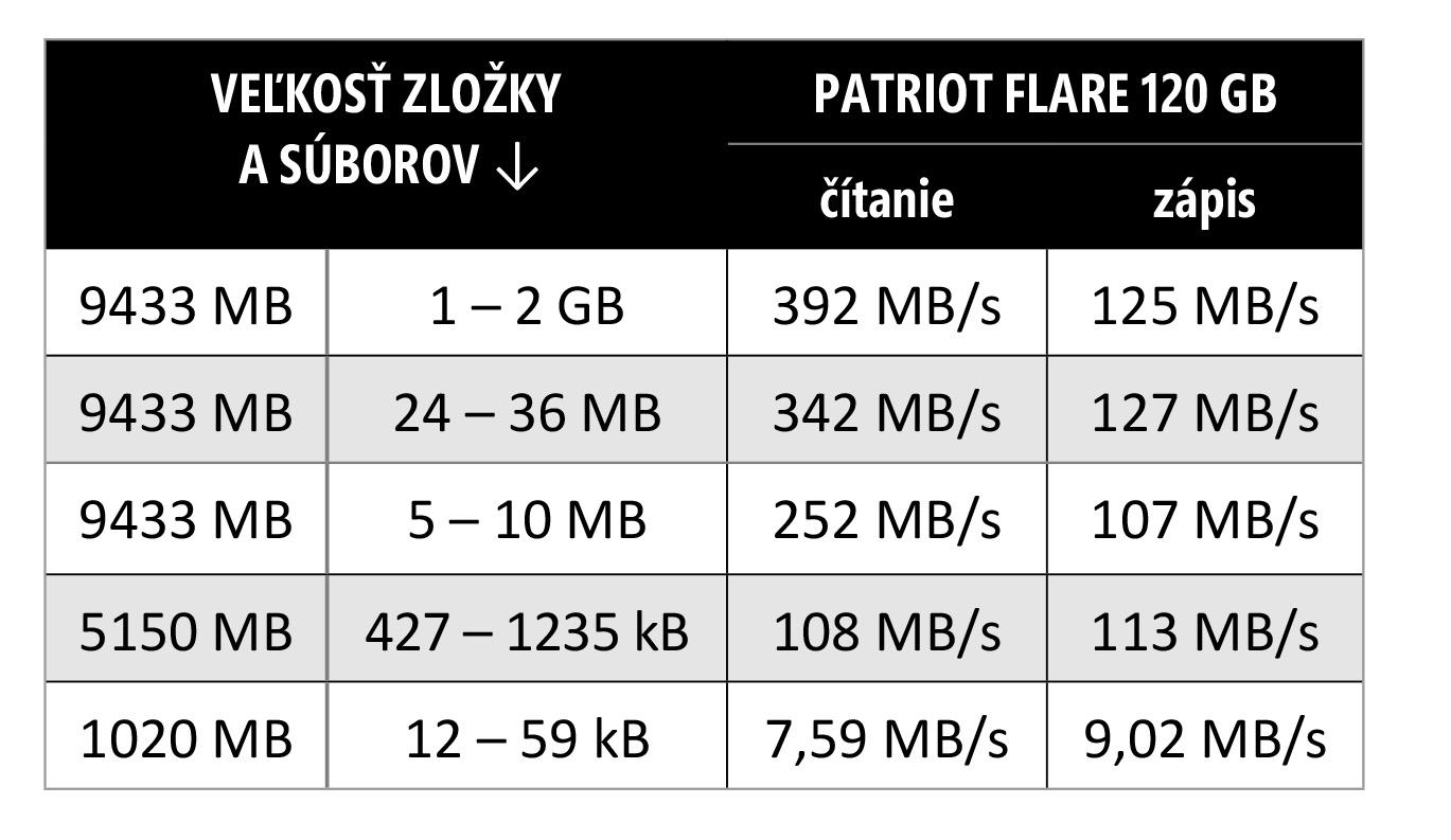 Výkon uvádzaný v špecifikáciách (555 MB/s pri čítaní a 475 – 535 MB/s pri zápise) treba brať s rezervou. Okrem toho, že ide o syntetické merania, sú založené na prenosoch malého množstva vzoriek, ktoré nereflektujú reálne použitie. Reálne sekvenčné čítanie sa pohybuje pri maximálnom výkone (t. j. pri práci s veľkými súbormi) okolo 392 MB/s. Pri už pomerne malých (427 – 1235 kB) súboroch je potom rýchlosť tretinová. A hoci už smeruje k rýchlostiam platňových diskov, vždy je o trochu vyššia. Na úroveň HDD (či skôr pod ňu) klesá toto SSD až pri sekvenčnom zápise. Nábeh je síce vždy pomerne slušný, no len do momentu, kým nepretečie SLC buffer, dovtedy rýchlosť mierne presahuje 300 MB/s. Po zapísaní zhruba 3,5 GB výkon rapídne klesá a prenosová rýchlosť je na úrovni 80 MB/s. Takto hendikepované nie je SSD iba pri zápise veľkých súborov, ako to často býva, ale i menších. Výkonnostne ide skrátka o najnižšiu triedu so všetkým, čo k nej patrím. Tým však nechcem tvrdiť, že je to zlé SSD, naopak. V tejto cenovej relácii je to štandard, dôležitý je rýchly prístup, čo je kľúčový parameter, vďaka ktorému majú lacné SSD zmysel. Náhodný prístup čítania/zápisu 512 B blokov je v prípade Patriot Flare 0,048/0,052 ms, resp. 20 035/18 255 IOPS. Inými slovami, aplikačný výkon je mimoriadne vysoký – podobne ako pri všetkých SSD. Flare mierne znevýhodňuje vyššia cena za 1 GB (WD Green je v priemere o 7 eur lacnejší), ale na oplátku je tu pridaná hodnota v podobe pamätí s vyššou životnosťou, než majú cenovo ekvivalentné SSD. Takže ak neplánujete z SSD iba čítať, ale aj masívnejšie ho prepisovať, Patriot Flare je presne to, čo hľadáte, a môžem ho odporúčať.