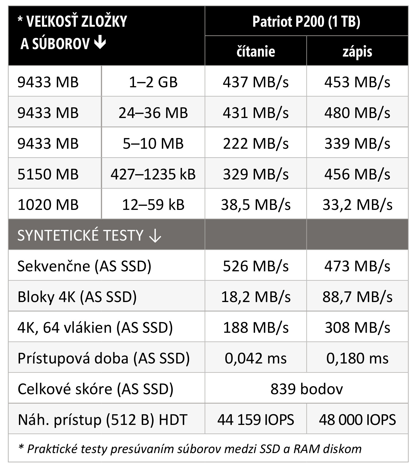 Na druhej strane treba poznamenať, že P200 má naprieč celým spektrom prenášaných súborov pomalší sekvenčný zápis o 7 – 34 %. Patriot najviac stráca pri menších (5 – 10 MB) a veľmi malých súboroch (12 – 59 kB). Pri sekvenčnom čítaní je to už vyrovnané a dokonca s veľmi malými súbormi si P200 poradí o trochu lepšie a aj prístupová doba čítaní najmenších blokov hrá do karát Patriotu. Vyšší výkon v tomto smere dokladá tak AS SSD, ako i HD Tune.
