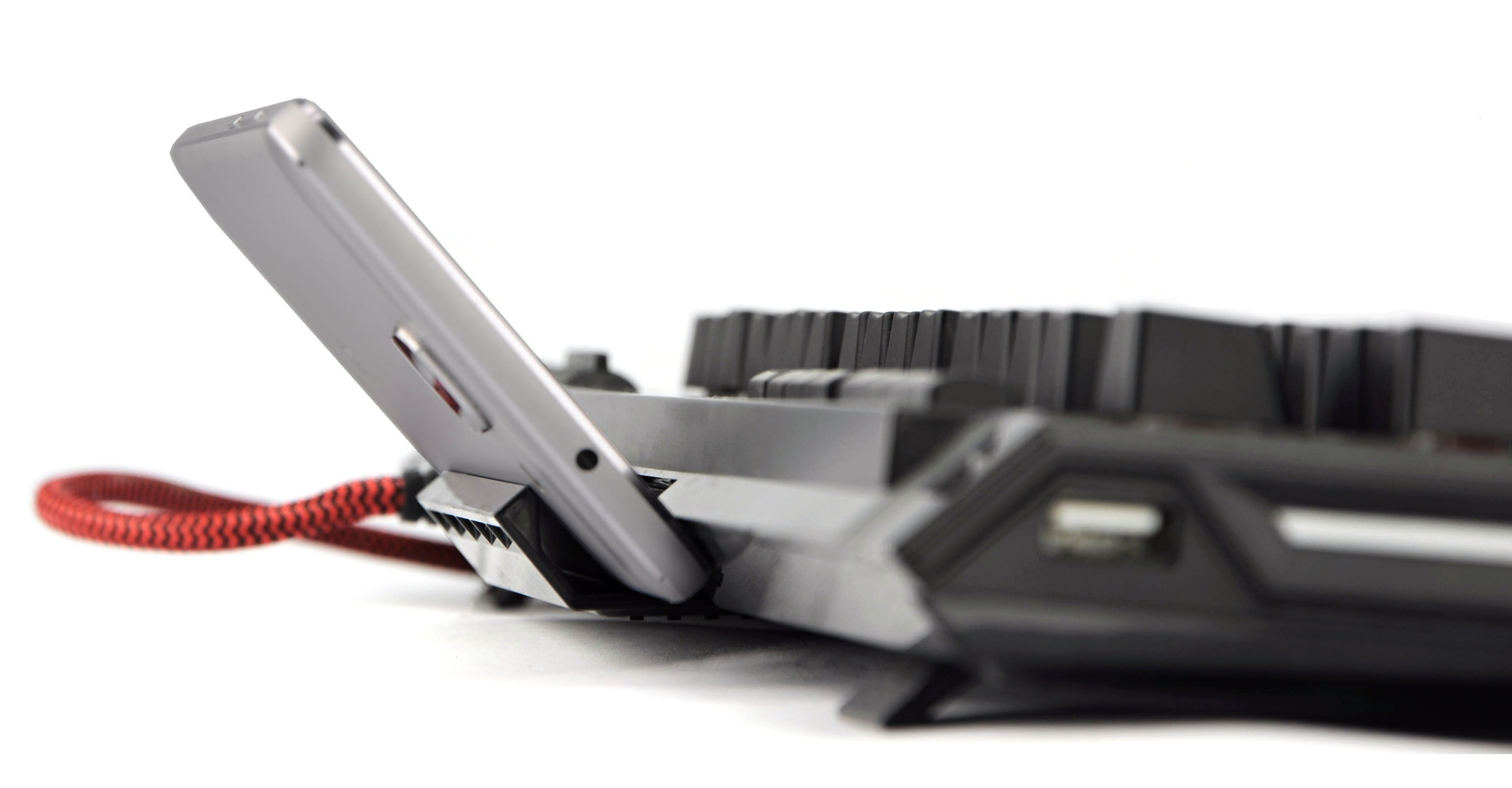 Ak chcete mať smartfón stále na očiach, zrejme oceníte výsuvný držiak určený na tento účel, situovaný do stredu zadnej časti klávesnice