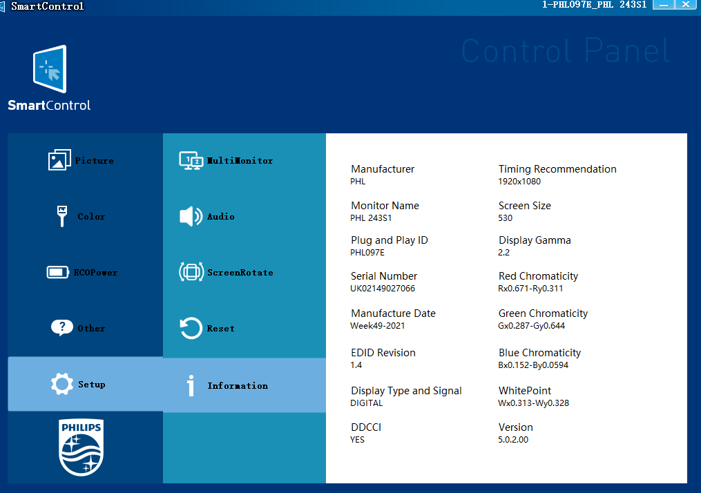 Ovládanie je sústredené vpredu na pravej strane. Pokiaľ však chcete monitor ovládať elegantnejšie a jednoduchšie, stačí si zo stránky výrobcu stiahnuť utilitu Smart Control, pomocou ktorej môžete všetky funkcie a nastavenia ovládať priamo z aplikácie.