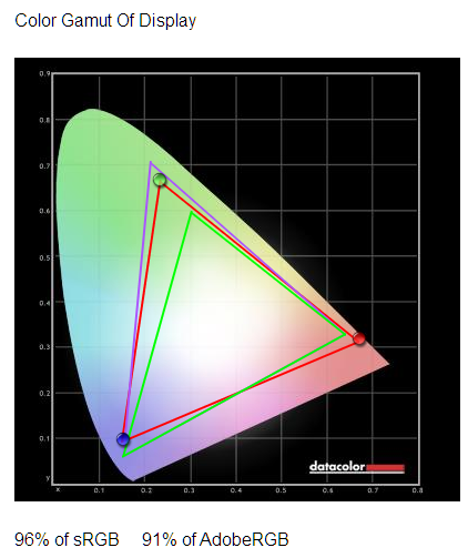Aj keď výsledky merania ukazujú malý odklon grafu v modrých odtieňoch, vďaka čomu dosahuje pokrytie sRGB 96 %, pokrytie Adobe RGB je veľmi dobrých 91 %. Statický kontrast dosahuje 420:1 a maximálny jas 268 cd/m2. Monitor však naozaj prekvapil špičkovou presnosťou farieb, akú neraz nedosahujú ani podstatne drahšie modely. Priemerná farebná odchýlka δE=1 bola tentoraz dosiahnutá tak, že ani na jednej farbe sa odchýlka nedostala cez túto hodnotu. Výborný výsledok. Zvuk je použiteľný a aj dosť výkonný, ale chýba mu basová zložka.