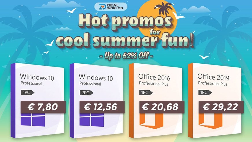 Aj keď sa téma módy a cestovania zdá byť počas leta kľúčová, Dealworlds.com sa tiež rozhodol zverejniť ponuky v rámci letného výpredaja, ktoré budú oslavovať toto veľmi žiadané obdobie. Na ochladenie cien možno využiť širokú škálu ponúk, vrátane polovičnej ceny za operačný systém a 62% zľavy na produkty MS Office. Aktualizácia počítača, obnova softvéru a zvýšenie produktivity nikdy nemôžu byť také ľahké s globálne platnými Windows 10 a MS Office na Dealworlds. Jednoducho vložte zodpovedajúci kód kupónu do nákupného košíka a môžete si užívať úspory.