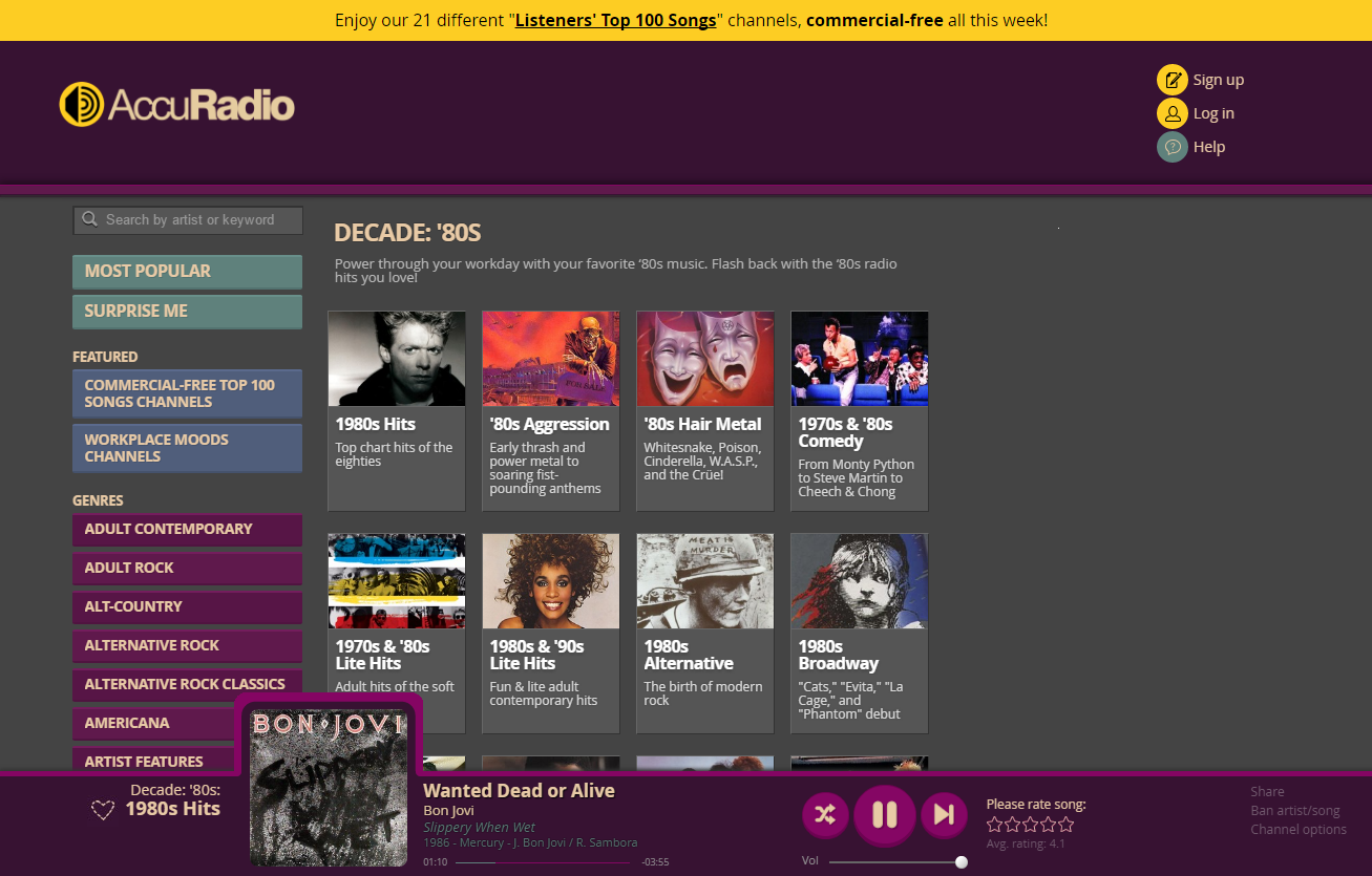 Táto služba priťahuje poslucháčov graficky prepracovaným rozhraním webu. Jej úvodná stránka vám ponúkne veľkú zásobu žánrových kategórií. Tie sú natoľko prepracované, že obsahujú aj rádiá s hudbou na určitú náladu či príležitosť. Prehrávanie je možné aj bez registrácie, a ako to už býva, po registrácii a prihlásení dostanete možnosť zaraďovať stanice medzi svoje obľúbené. Navyše budete počuť menej reklamy a budete mať k dispozícii svoju históriu počúvaní. Pri našom teste potešila aj možnosť prehrať si niektoré z rádií, ktoré hrajú top 100 skladieb počúvaných poslucháčmi webu, ktoré si možno vypočuť celkom bez reklám. S tým súvisí možnosť hodnotenia jednotlivých prehrávaných skladieb maximálne piatimi hviezdičkami. To sa dá uskutočniť pomocou prehrávača v spodnej časti obrazovky, ktorý pri každej skladbe zobrazuje aj titulný obrázok z nosiča, z ktorého pochádza, a zopár doplňujúcich informácií, ako napr. rok vzniku skladby a názov vydavateľstva, v ktorom vyšla. Ak sa zaregistrujete, budete mať možnosť nastaviť si viacero staníc, ktoré stlačením príslušného tlačidla môžete prepínať nenásilným prelínaním zvuku. Na pravej strane prehrávača nájdete prvky na zdieľanie a vylúčenie skladby či interpreta zo svojho vkusu.