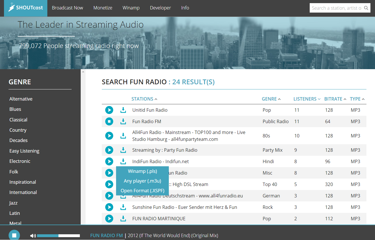 Nielen tí, ktorí si spomenú na legendárny prehrávač Winamp, budú vedieť, o čo tu ide. Shoutcast vznikol v 90. rokoch a v podstate je to API. Rôzne weby ho môžu použiť ako súčasť svojho obsahu, vývojári ako súčasť aplikácií a domácich mediálnych centier, no jeho služby sú prístupné aj priamo na doméne shoutcast.com. Databáza je gigantická, obsahuje viac ako 70 000 internetových rádií. Rozhranie je dosť sparťanské a autori si nelámali hlavu s príťažlivosťou. Na ľavej strane sú základné kategórie rádií a po ich otvorení si môžete zvoliť aj podkategóriu. Keďže je staníc extrémne množstvo, kvalita je rôzna. Reklamy sa v streamoch nachádzajú a prehrávač poskytuje len základné funkcie na zmenu hlasitosti, spustenie, zastavenie prehrávania, informácie o názve stanice, interpretovi a názve práve prehrávanej skladby. Okrem prehrávania staníc je tu možnosť stiahnutia odkazu na ich stream vo formátoch .pls, .m3u a .XSPF. V pravom hornom rohu stránky nájdete aj fulltextové vyhľadávanie, ktoré sa pri takomto množstve rádií naozaj dobre uplatní. Na rozdiel od konkurencie tu môžete nájsť aj možnosť vytvorenia vlastného internetového rádia a speňaženia jeho obsahu. Nepáčilo sa nám, že po zastavení prehrávania sa prehrávač zasunie, nemožno ho jednoducho obnoviť a objavili sme aj drobné bugy. Rovnako ako ostatné služby aj Shoutcast existuje vo forme mobilných aplikácií.
