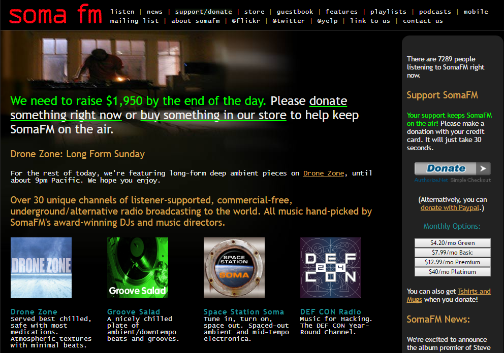 Pre tých, ktorí hľadajú rádiá bez reklám a bez nutnosti registrácie, je tu služba Soma fm, ktorá síce nedisponuje obrovskou databázou staníc, ale aj tak má svoje pozitíva. Obsahuje viac ako 30 rádií rôznych žánrových zameraní a zrejme ide o projekt skupiny nadšencov, keďže ponúka počúvanie zadarmo, no naznačuje, že finančné príspevky potrebuje na svoje ďalšie fungovanie. Web pôsobí tak trošku zastaraným dojmom, no funkciu splní. V základnom nastavení sa po kliknutí na stanicu otvorí ďalšie okno s webovým prehrávačom. Ten obsahuje vysielací program zvolenej stanice a aj funkciu s ukladaním vašich obľúbených staníc alebo skladieb. Pri každom rádiu si možno zvoliť z niekoľkých kvalít streamu a za pozitívum považujeme slobodu možností prehrávania. Soma fm vás nenúti používať zabudovaný prehrávač, naopak, poskytuje niekoľko odkazov na populárne mediálne prehrávače a pri každom rádiu si môžete priamo stiahnuť odkaz na jeho stream, ktorý takýto externý prehrávač môže prevziať. Vpravo na stránke nájdete zoznam momentálne najpopulárnejších interpretov na tomto webe a po kliknutí na konkrétneho z nich budete presmerovaní na Amazon, kde si môžete jeho hudbu zakúpiť. Keby ste si web obľúbili, je tu aj možnosť zaobstarať si tričká či mikiny s jeho logom. Aby nezaostávala za konkurenciou, stránka ponúka takisto počúvanie cez mobilné aplikácie na iOS a Android. Na počúvanie cez zariadenia s mobilným Windows poslúži aplikácia tretej strany.