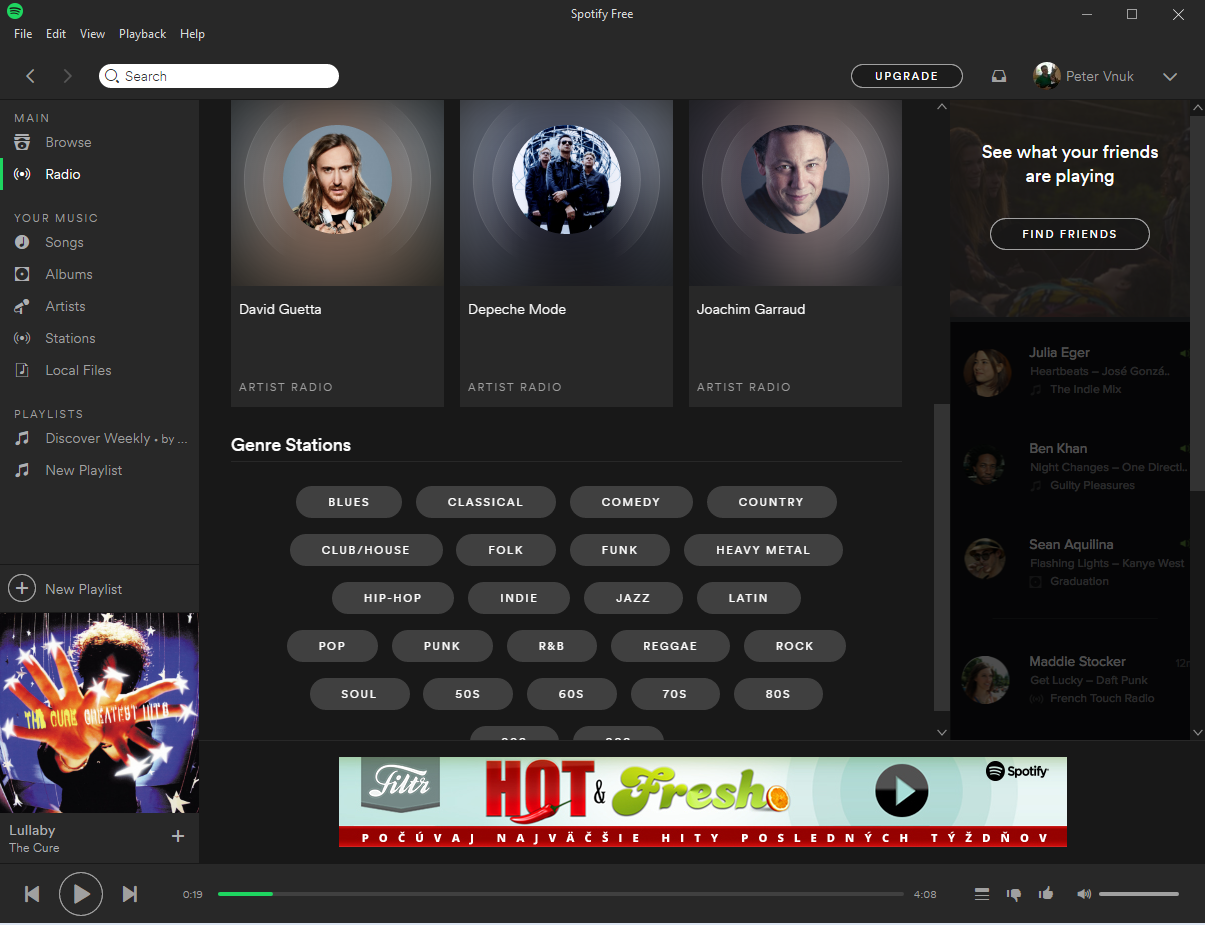 Áno, tento populárny prehrávač hudby obsahuje aj prehrávanie internetových rádií. Aj keď to nie sú celkom plnokrvné rádiá, ale skôr playlisty, na ktorých sa neustále streamuje hudba konkrétneho interpreta alebo konkrétneho žánru. Slúžia preto veľmi podobne ako klasické komerčné stanice, keďže tiež obsahujú zvukové reklamy, no výhoda je v možnosti preskočenia skladieb a pozastavenia prehrávania, čo neponúka každý konkurent. Zvolíte si interpreta alebo žáner a môžete ho počúvať, ako dlho sa vám zachce. Na to treba mať nainštalovanú aplikáciu Spotify, ktorú stiahnete z webu. Ak si zvolíte druhú alternatívu, teda prehrávač vo webovom prehliadači, ten neobsahuje funkcie spojené s rádiami. Prihlásiť do aplikácie sa budete môcť pomocou účtu na Spotify, ale aj pomocou svojho Facebooku. Prvá možnosť prináša výhodu v tom, že služba od registrácie pozná váš hudobný vkus a bude vám servírovať interpretov aj žánre, ktoré by vám mali byť po chuti. Aplikácia je slušne prepracovaná a ovláda sa intuitívne. Prehrávač je umiestnený klasicky v spodnej časti obrazovky a okrem bežných ovládacích prvkov, názvu rádia a prehrávanej skladby obsahuje aj možnosť stanicu „lajkovať“. Vizuálna reklama tu je prítomná, no možno ju odstrániť prechodom na platenú verziu, ktorá stojí 5,99 eura mesačne. Na mesiac dostanete túto možnosť zadarmo.