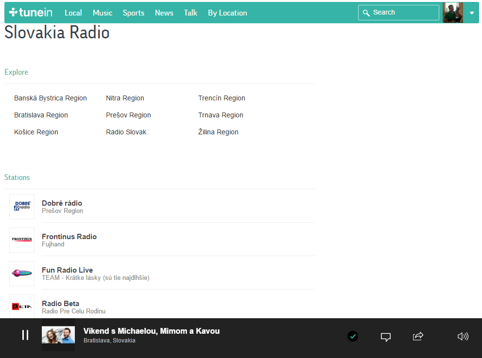 Služba Tunein umožňuje začať s počúvaním veľmi rýchlo. Môžete sa zaregistrovať, no keby sa vám do toho nechcelo, je tu možnosť prihlásiť sa pomocou svojho účtu na Facebooku alebo na Google. Menu je rozdelené na niekoľko základných kategórií, podľa ktorých môžete vyhľadať rádiá, ktoré vám budú vyhovovať. Napríklad po kliknutí na kategóriu Local sme dostali šancu počúvať päť slovenských rádií, hoci by sme ich čakali viac, hlavne tých komerčných. No to nič, pretože k ostatným slovenským rádiám sa dostanete cez položku v menu By Location. Zvolíte si Európu, Slovensko, dokonca si môžete vybrať aj podľa kraja. Po voľbe Music budú stanice rozdelené podľa hudobného žánru, ktorému sa venujú. Nechýbajú tu ani športové či spravodajské rádiá a rádiá zamerané na hovorené slovo. Webové rozhranie je pomerne jednoduché. Z funkcií je tu iba komentovanie rádií, ich zdieľanie na sociálnych sieťach a ukladanie do zoznamu vlastných obľúbených staníc, ktorý môže byť súkromný či verejný. Pochválime však profily jednotlivých staníc, ktoré obsahujú aj program vysielania a kontaktné informácie. Prehrávanie zvuku prebieha v spodnej časti webu a nie je závislé od vášho pohybu po stránke. K dispozícii je aj mobilná aplikácia na smartfóny a svoj účet môžete prepojiť so zariadeniami využívajúcimi služby Google TV, Yahoo TV, Blackberry a Roku. Chýbala nám možnosť voľby kvality streamu alebo aspoň informácie o šírke dátového toku.