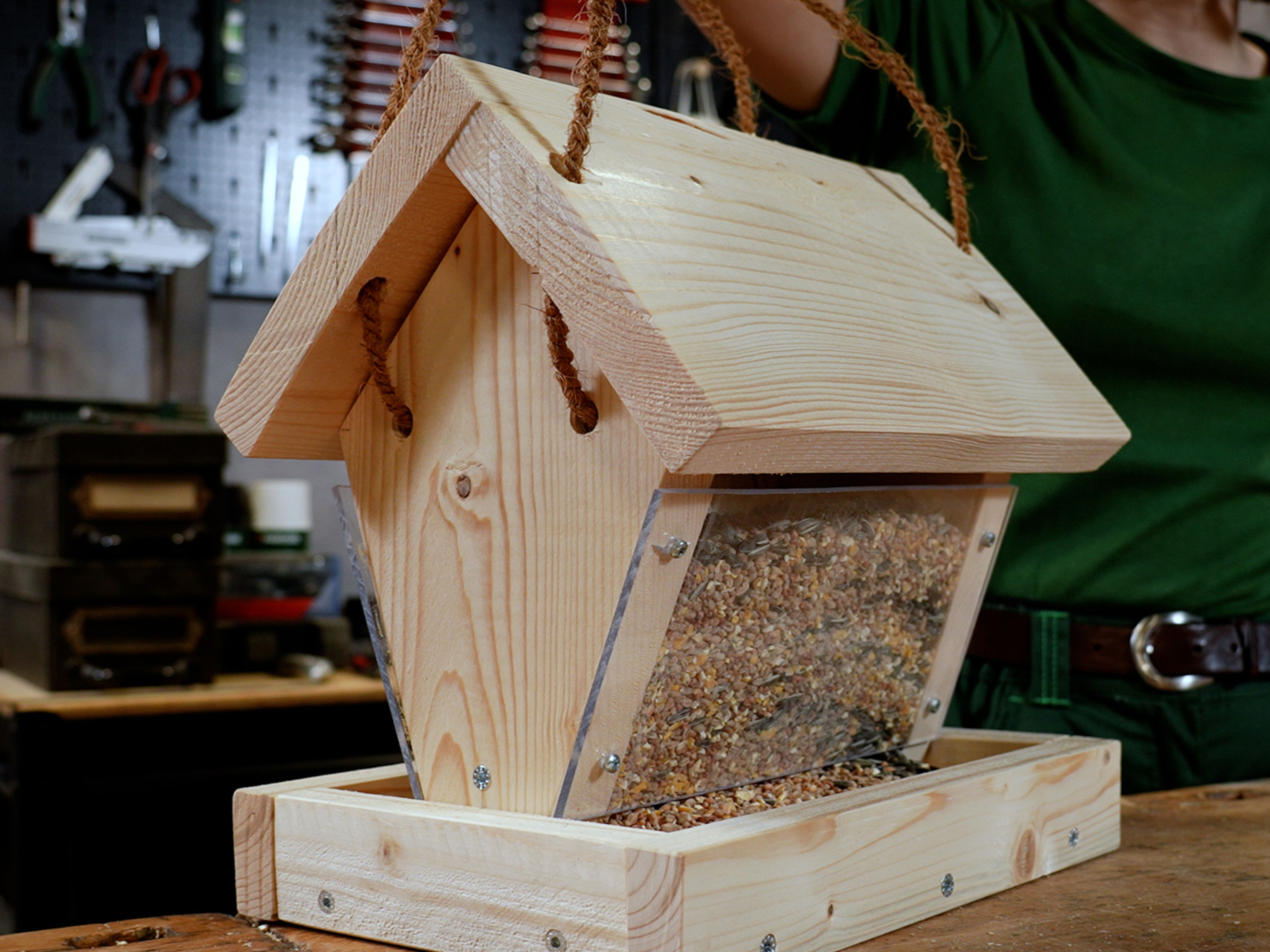 Obe časti strechy sa potom zlepia a zoskrutkujú k sebe, než sa namontujú priehľadné okná z akrylového skla. Tie vám umožnia vidieť množstvo krmiva. Nakoniec sa kŕmidlo vybaví závesným mechanizmom: do strechy a bočných stien sa vyvŕtajú dva otvory, ktorými sa prevlečie a uviaže lano. To uľahčuje neskoršie nadvihnutie strechy na doplnenie krmiva. Odporúčaný, hoci nepovinný krok je náter na vonkajšie použitie, ktoré chráni kŕmidlo pred poveternostnými vplyvmi a dodá mu osobitý nádych.