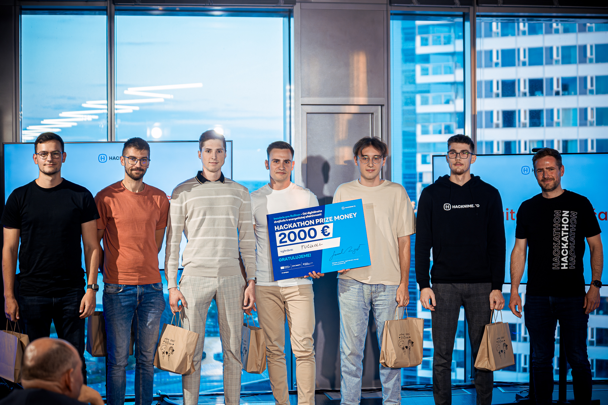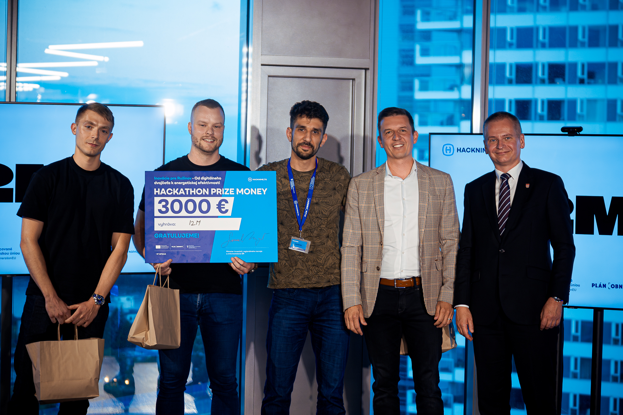Pred vyhlásením výsledkov sa na pódium postavil aj Viktor Štefaňák z Campus Innovation Hub, ktorý hackathony spoluorganizuje. Keďže sa jedná o záverečné Hacknime.to podujatie, ponúkol pohľad na hackathony v číslach. Zaujímavosťou je, že počas troch rokov trvania projektu sa na ňom zúčastnilo spolu cez 400 hackerov, z čoho bolo až 50% vysokoškolských a 30% stredoškolských študentov. Špeciálne ocenenie pre tím, ktorý sa najčastejšie umiestňoval na priečkach víťazov získal tím Lwíčkovci v zložení Roman Masár, Jakub Marcinát, Adam Tížik, Ján Krajčík a Matej Kuka. Od Campus Innovation Hub si tak zaslúžili pozvánku na networkingové stretnutie podnikateľov, investorov a inovátorov Doers Summit 2026 v Aténach.