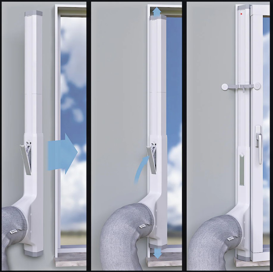 Z fyziky vieme, že keď potrebujeme z nejakého priestoru, v našom prípade z miestnosti, odobrať teplo, musíme ho niekam odviesť. Na tento účel slúži hadica, pomocou ktorej sa horúci vzduch z chladiacej jednotky vyfukuje preč z miestnosti. V balení nájdete súpravu na montáž s oválnym otvorom, ktorý môžete vložiť do pootvoreného okna. Umožňuje vyfukovať cez oválny otvor ohriaty vzduch z klimatizácie a zároveň zabraňuje tomu, aby teplý vzduch zvonku prúdil do miestnosti. Inštalácia klimatizácie, prípadne jej sfunkčnenie po prenesení do inej miestnosti je tak otázkou niekoľkých