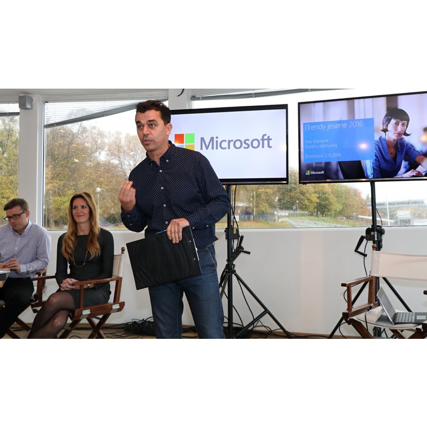 Výsledky spotrebiteľského prieskumu na tlačovej konferencii prezentovali riaditeľka spotrebiteľského segmentu spoločnosti Microsoft Kristína Michalsky a Petr Klement, šéf produktovej skupiny Windows Client. Moderátora predstavovať nemusíme.