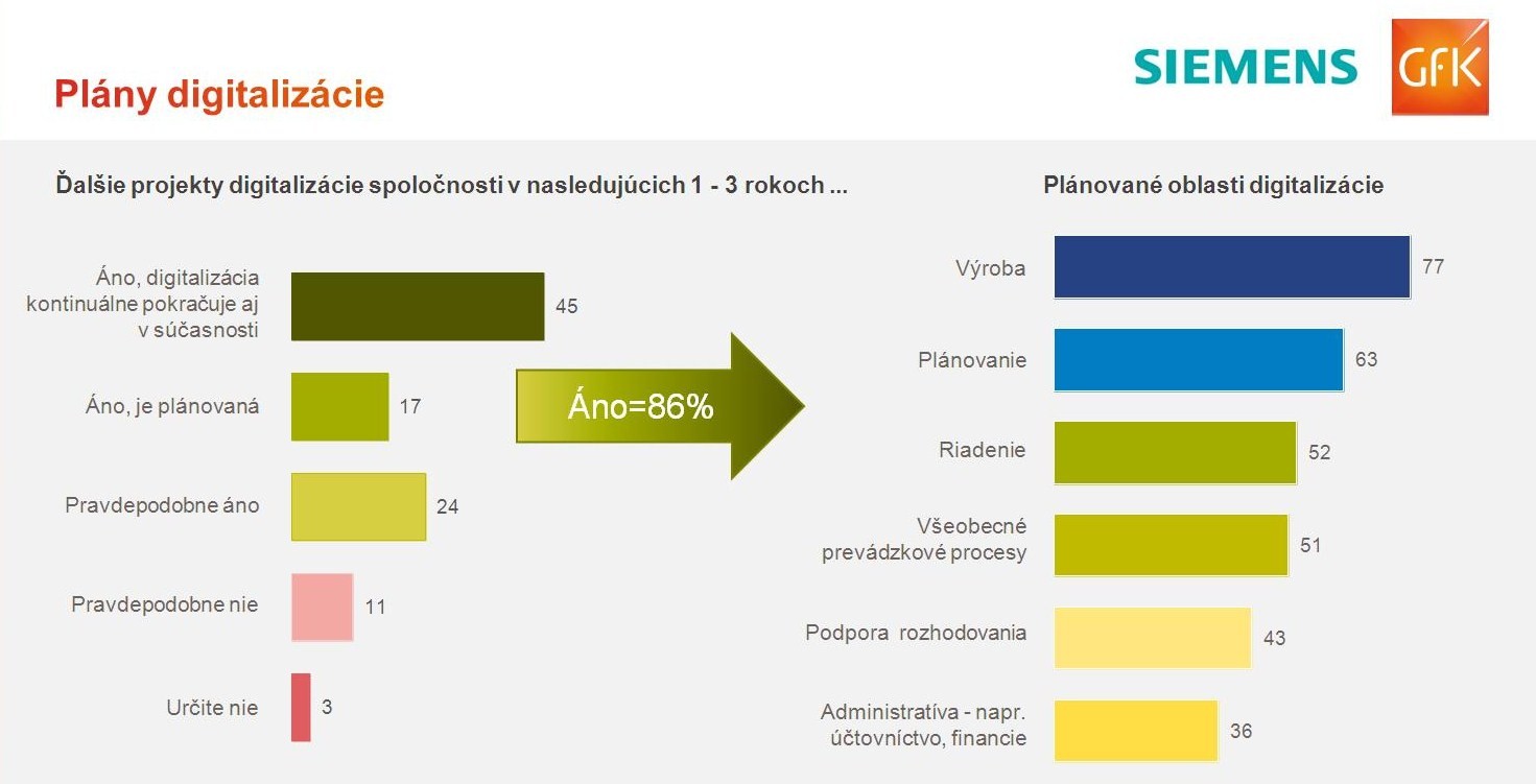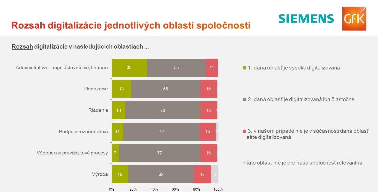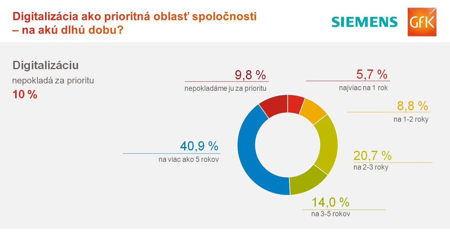 Až 90 percent firiem na Slovensku považuje digitalizáciu za svoju prioritu. Vidia jej jednoznačné prínosy, ale zároveň si uvedomujú, že sú len na začiatku dlhej cesty. Firmy na Slovensku vidia v digitalizácii možnosť zlepšiť svoju konkurencieschopnosť na domácom i regionálnom trhu. Neočakávajú pritom skokové prínosy, rátajú s dlhodobými efektmi a väčšina má plány digitalizácie rozložené na päť i viac rokov. Takéto zistenia priniesol prieskum agentúry GfK, ktorý pripravila pre spoločnosť Siemens. V auguste a septembri sa do neho zapojilo takmer dvesto spoločností po celom Slovensku, pričom osemdesiat percent bolo z priemyslu. Pokrok v administratíve Hoci závery prieskumu znejú optimisticky, ukázal, že firmy si doteraz digitalizáciu nesprávne zamieňali s automatizáciou. „Ich predstavu o digitalizácii najlepšie opisuje automatizácia - zber údajov a analýza a optimalizácia procesov. Sústreďovali sa najmä na administratívu a plánovanie. Tieto oblasti uviedli ako najlepšie rozpracované ...Článok je uzamknutý