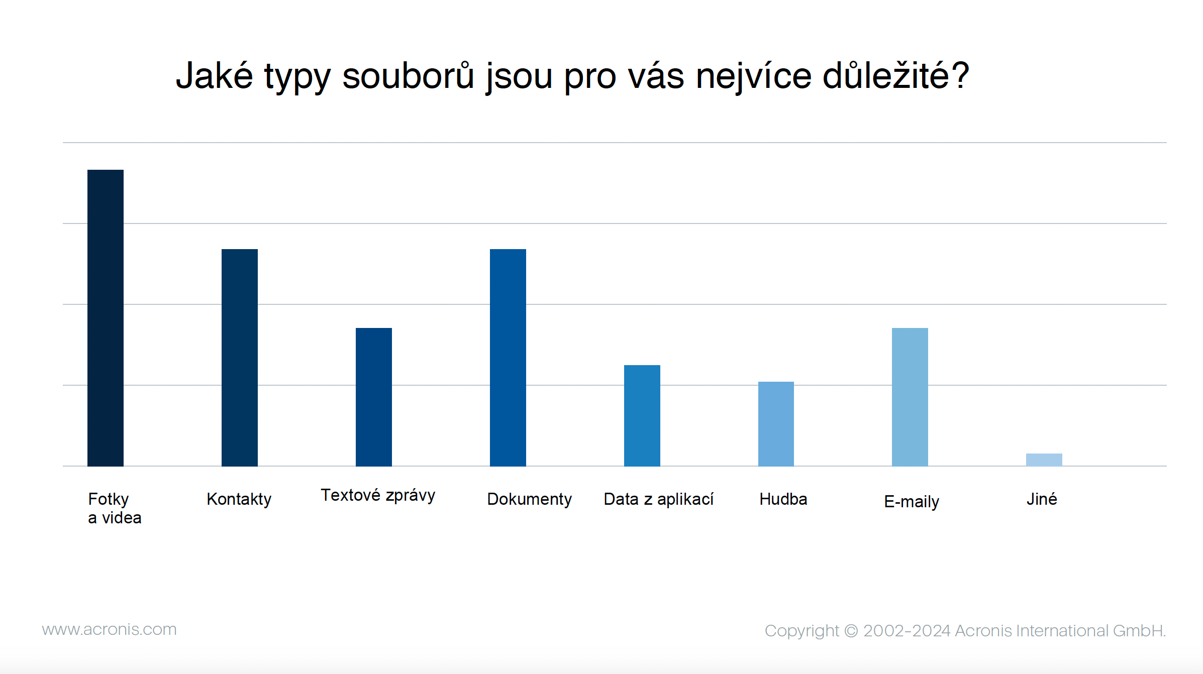 - Osobné fotografie a videá sú najdôležitejšie: Zatiaľ čo dokumenty a e-maily obsahujúce citlivé obchodné a osobné informácie bývajú najcennejšie, 74 % domácich používateľov považuje za najdôležitejšie osobné fotografie a videá, 54 % dokumenty a kontakty a 33 % textové správy.