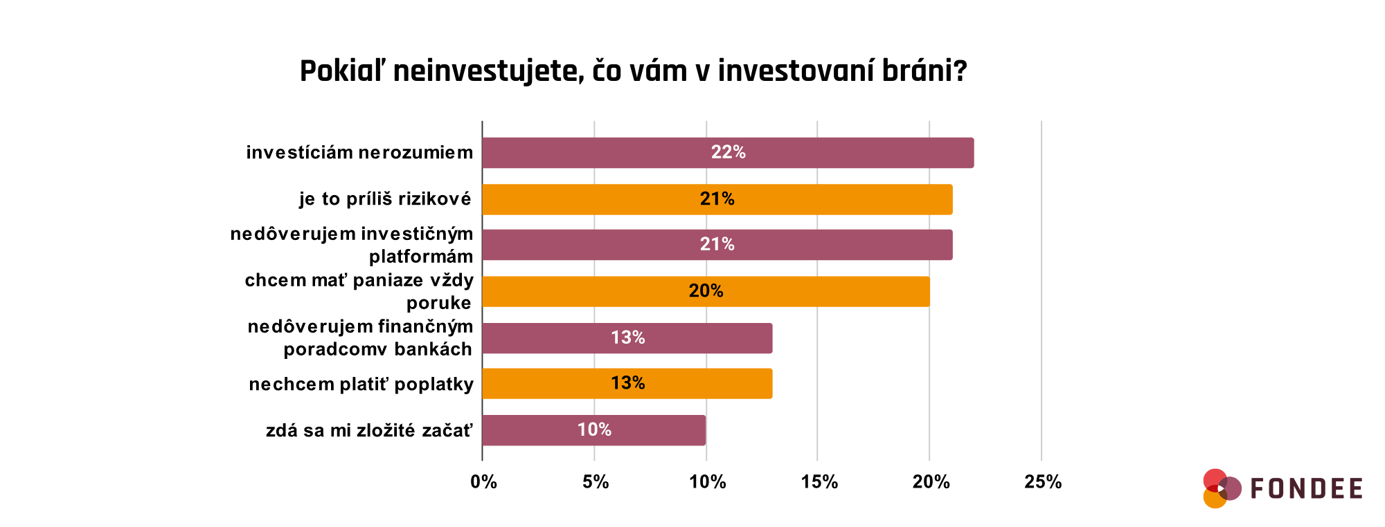 Slováci využívajú stále v drvivej väčšine hlavne tradičné investičné produkty, no zároveň priznávajú, že by mohli investovať aj lepším spôsobom. Prevláda názor, že by svoje úspory tiež dokázali zhodnocovať efektívnejšie, no majú z investovania obavy a pre investičné rady si stále chodia do bánk alebo k investičným poradcom. Aj taká je finančná gramotnosť Slovákov. Vyplýva to z prieskumu, ktorý si na začiatku roka nechala vypracovať investičná platforma Fondee. Český startup len nedávno expandoval na Slovensko, a už dnes sa teší prvým stovkám? spokojných klientov. Prieskum spracovala prieskumná agentúra 2muse a prebehol na reprezentatívnej vzorke 556 respondentov.