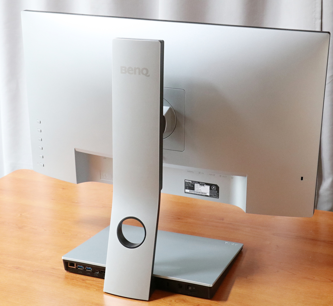 Pri monitore je dôležitý aj dizajn zadnej steny, práve tú totiž v kancelárii uvidí návšteva. BenQ PD2710QC aj z tohto pohľadu vyzerá elegantne a atraktívne. Veľký otvor v nohe stojana umožní prehľadne organizovať káble.
